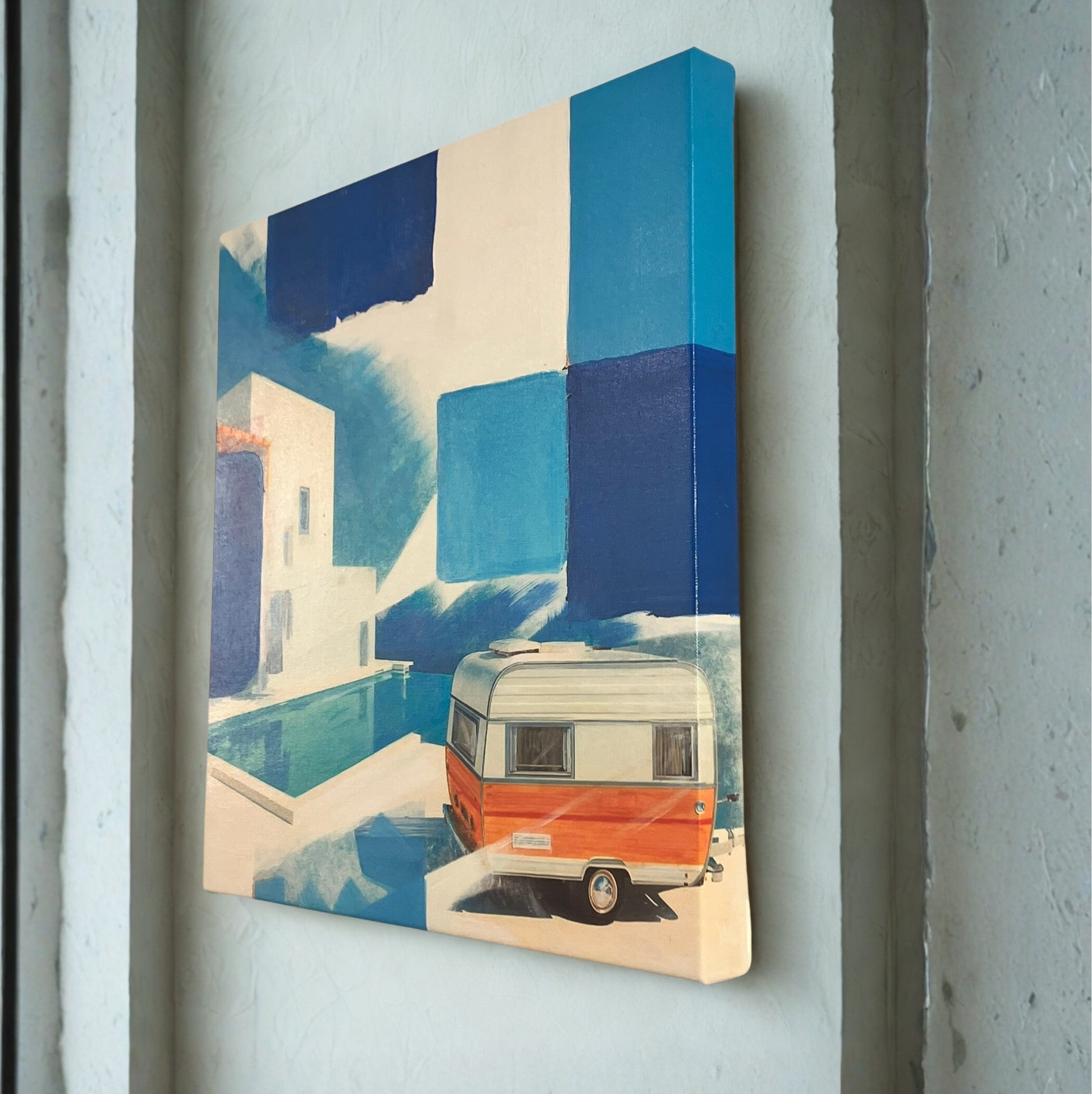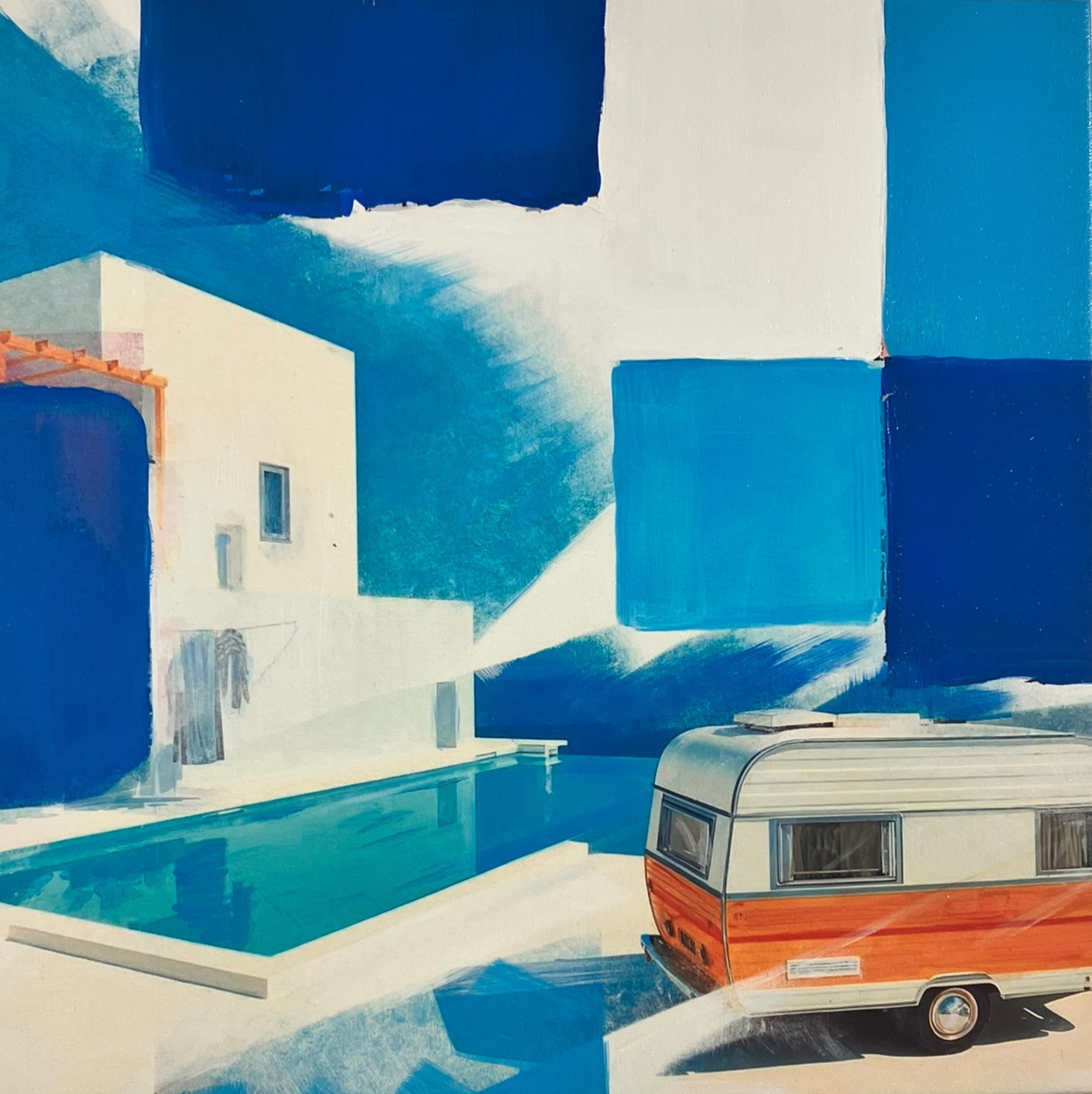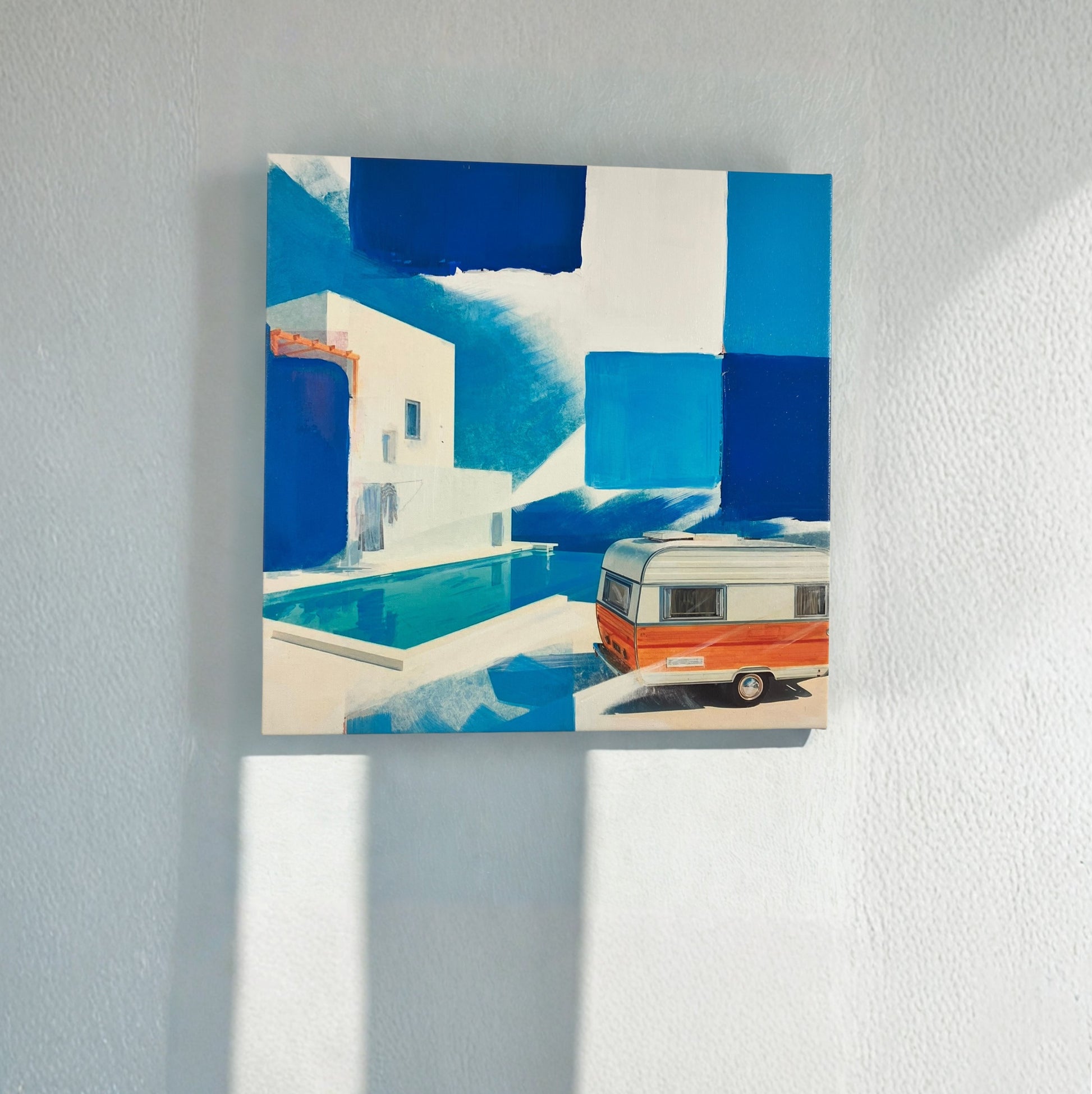 La composición articula un espacio habitable —una casa blanca y una piscina contenida— en contraste con la presencia inesperada de una caravana, símbolo de desplazamiento y vida nómada. Este elemento introduce una narrativa sobre el habitar contemporáneo, situada entre la estabilidad del refugio y la libertad del tránsito.