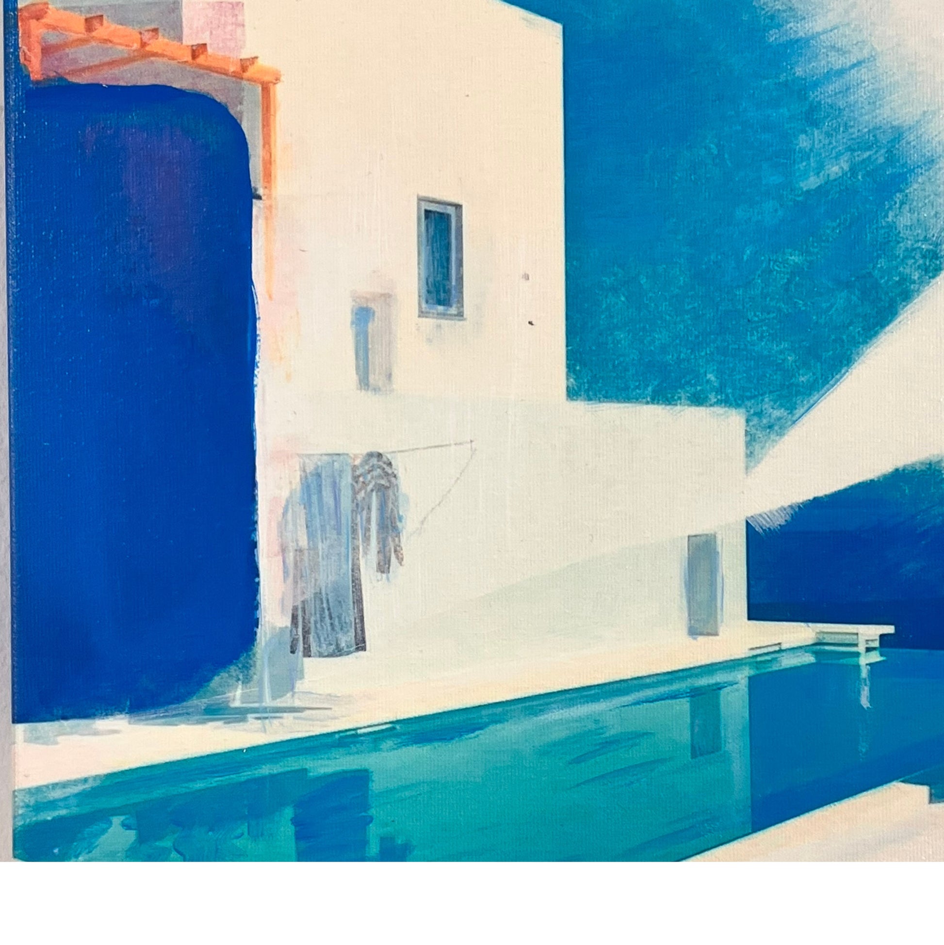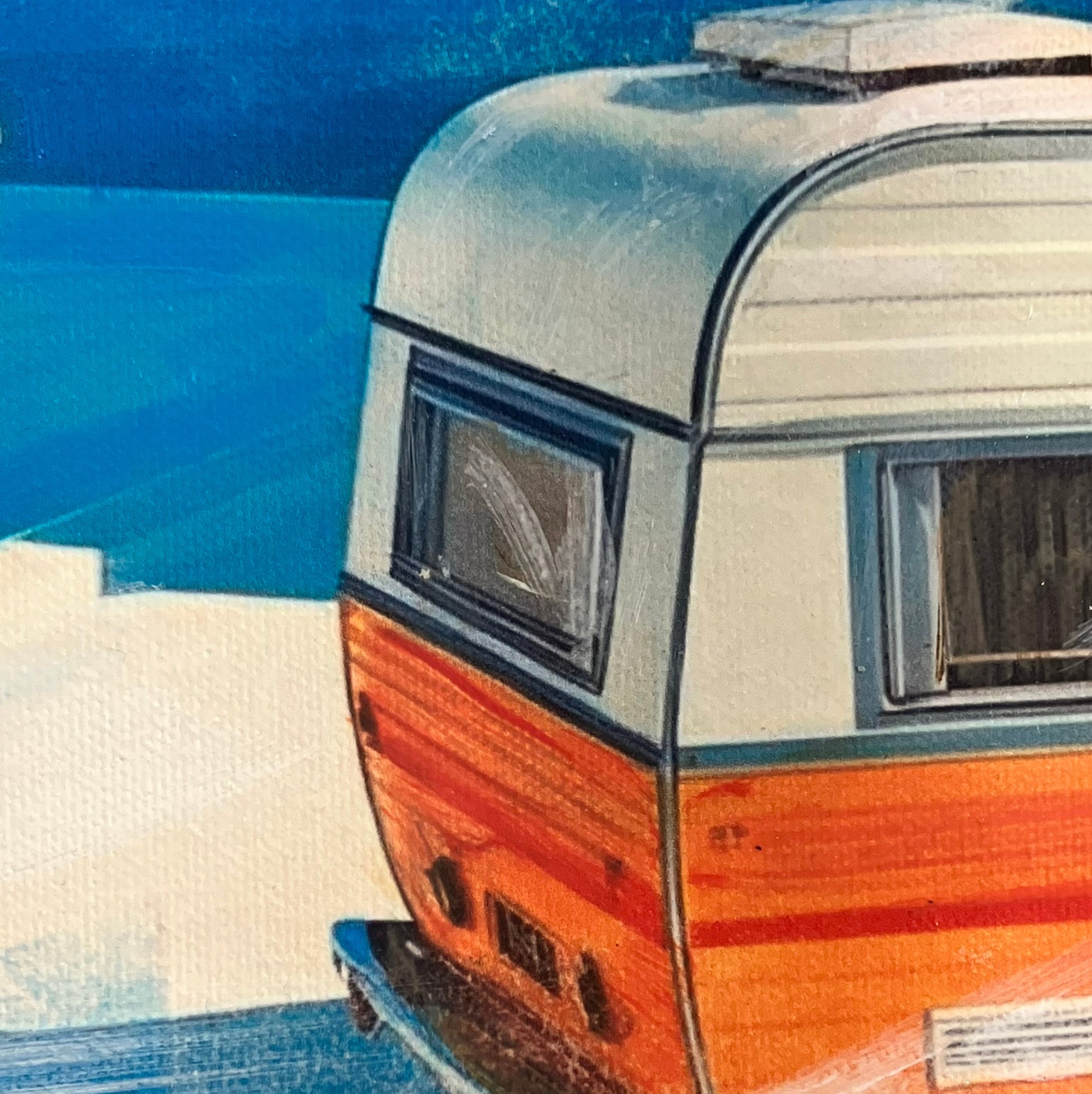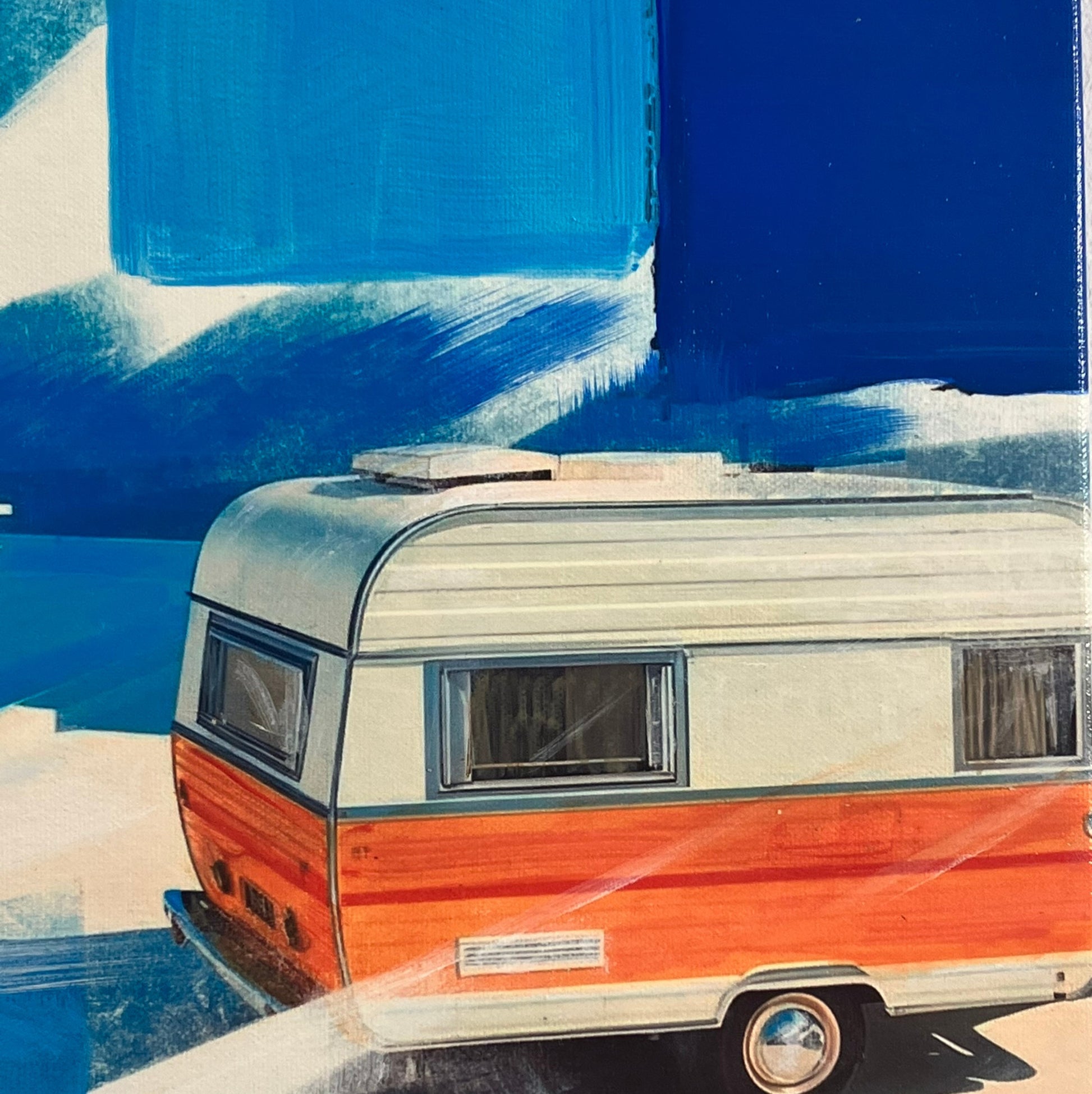 La composición articula un espacio habitable —una casa blanca y una piscina contenida— en contraste con la presencia inesperada de una caravana, símbolo de desplazamiento y vida nómada. Este elemento introduce una narrativa sobre el habitar contemporáneo, situada entre la estabilidad del refugio y la libertad del tránsito.
