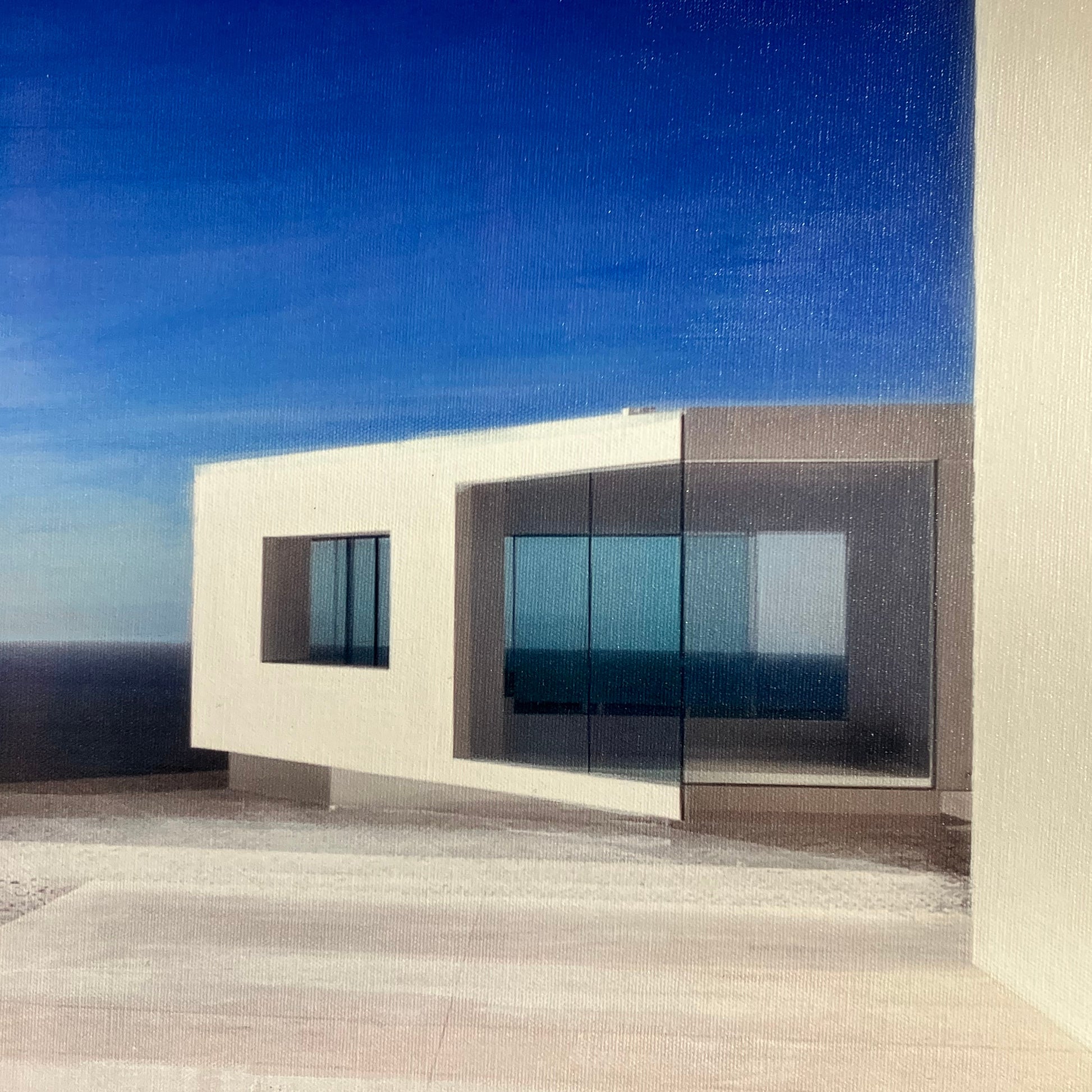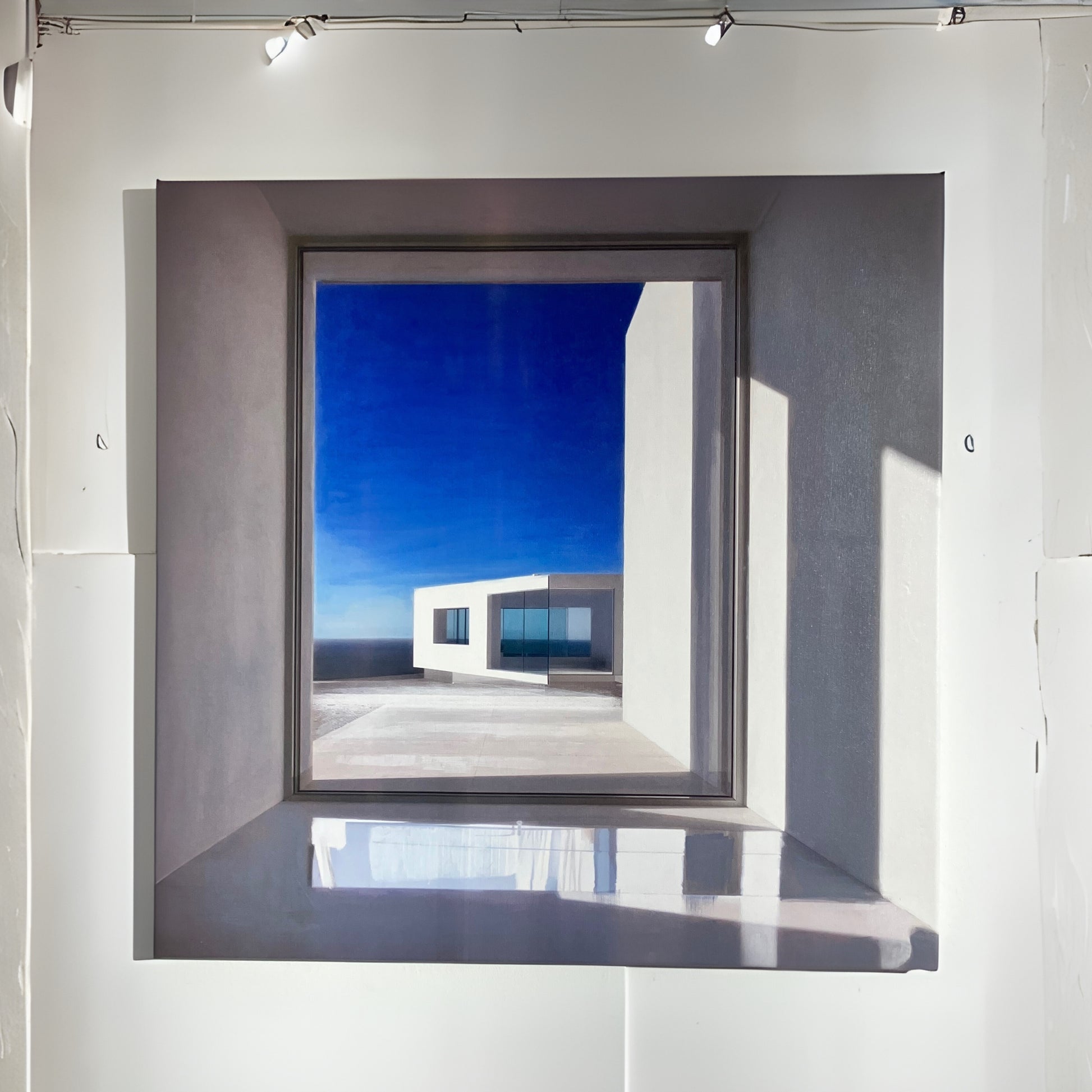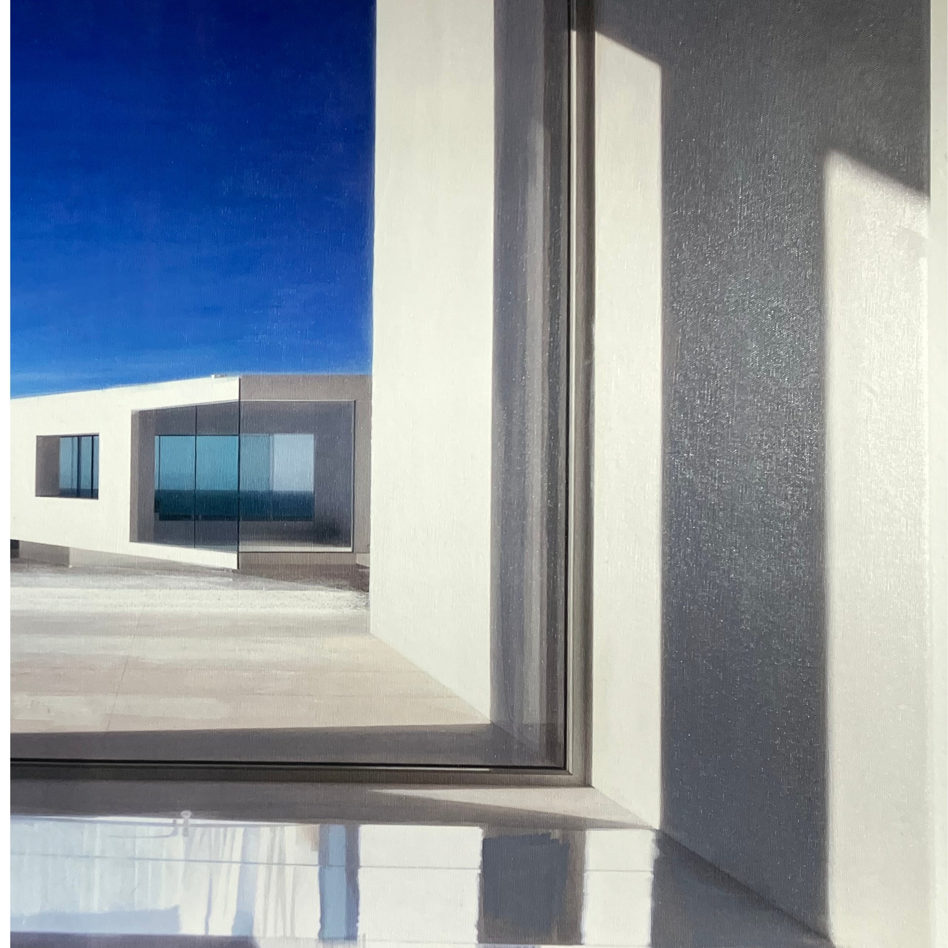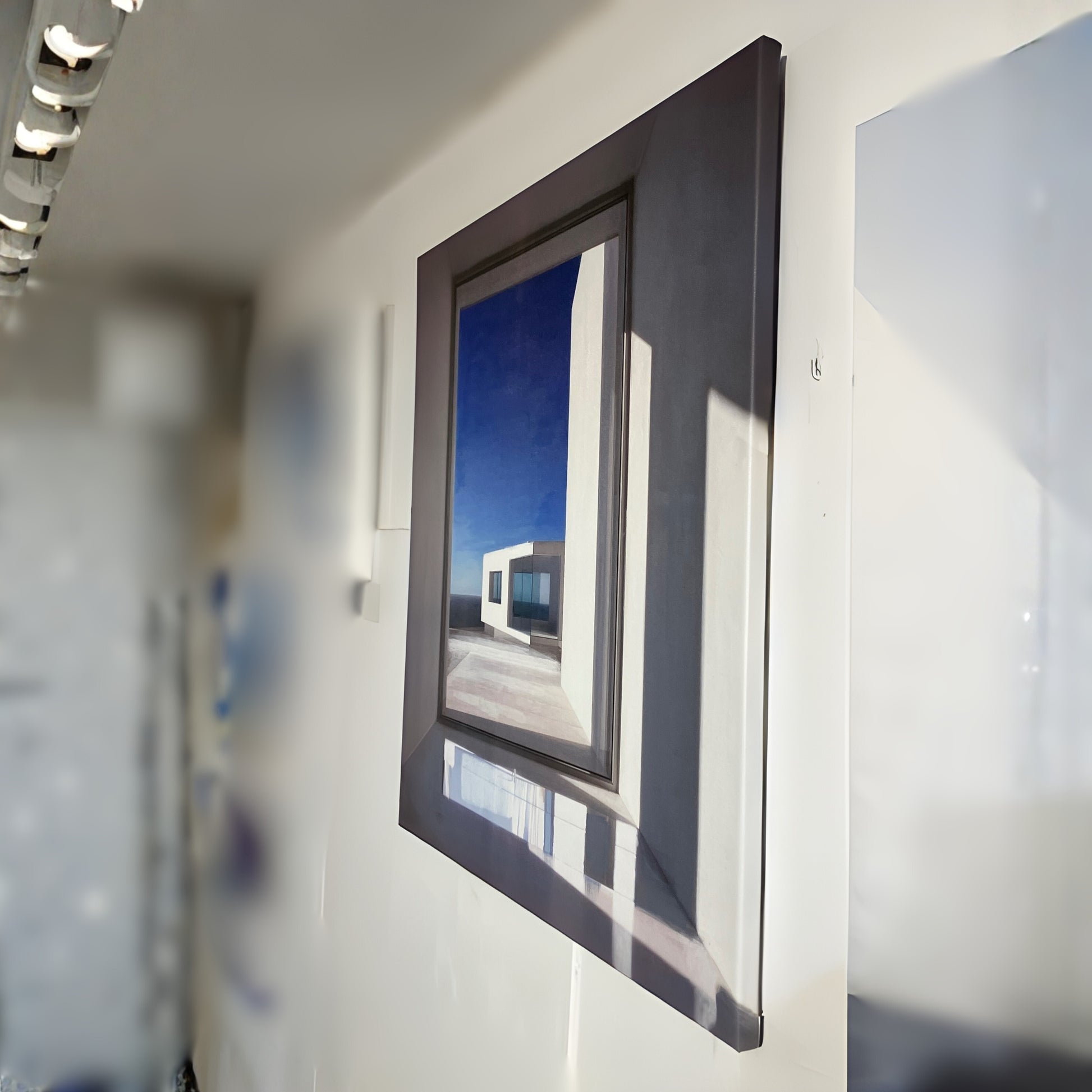 En ESSENTIA X la mirada se invierte. Por primera vez en la serie, observo la arquitectura desde un espacio interior: un marco dentro del cuadro que señala el límite entre lo ideal y lo real. La figura humana ha desaparecido, pero su presencia se adivina en los rastros —la luz, los reflejos, la ropa tendida que irrumpe en la pureza arquitectónica.
