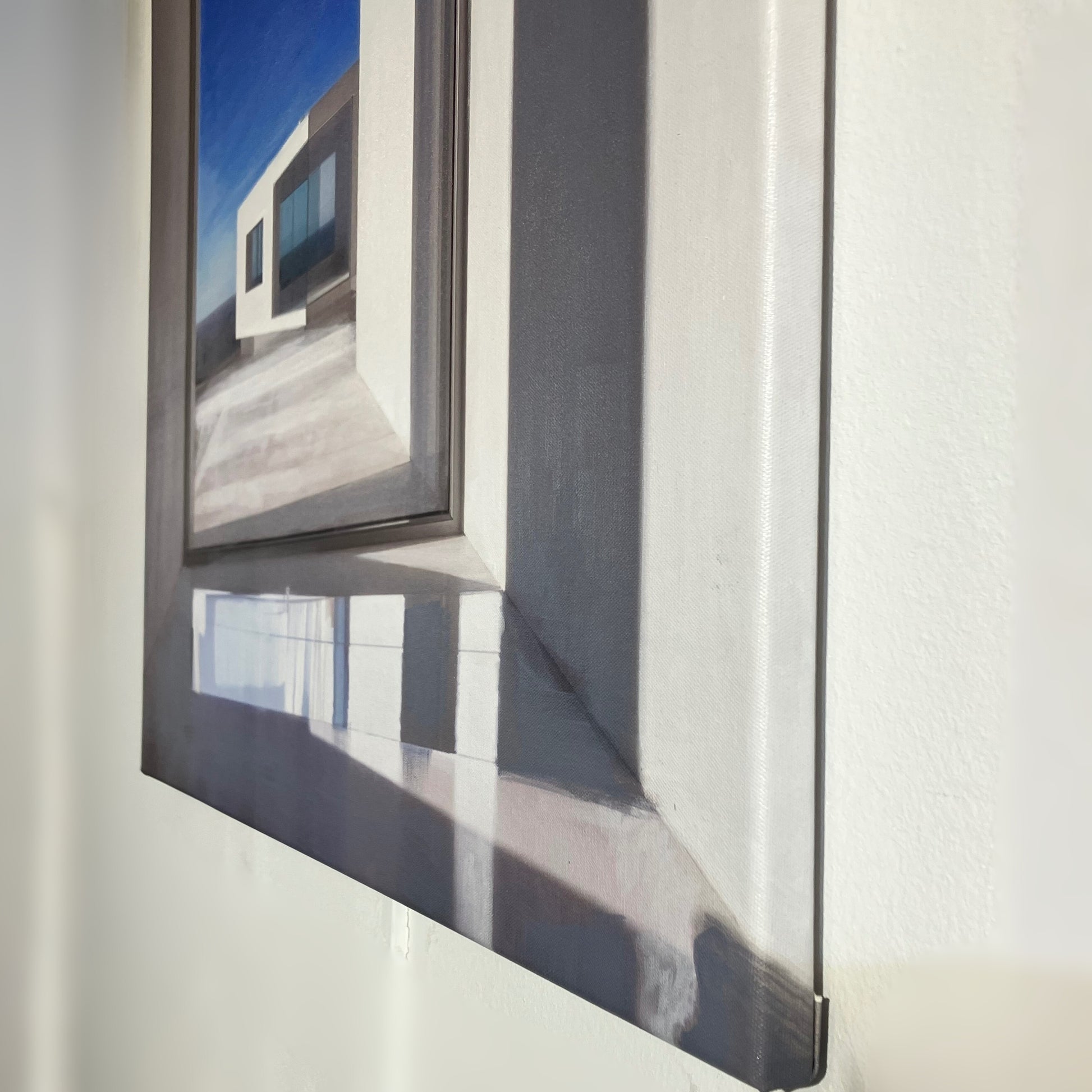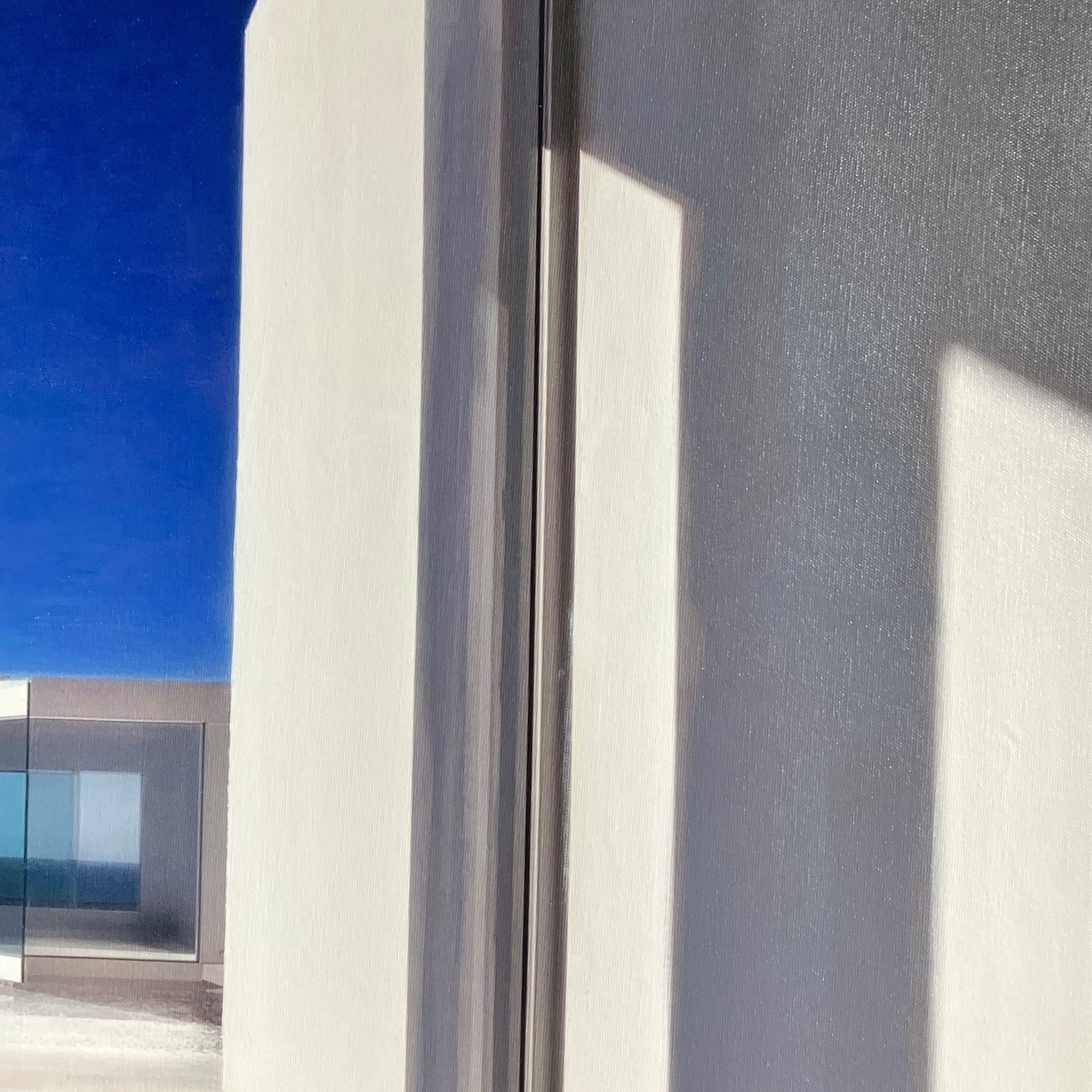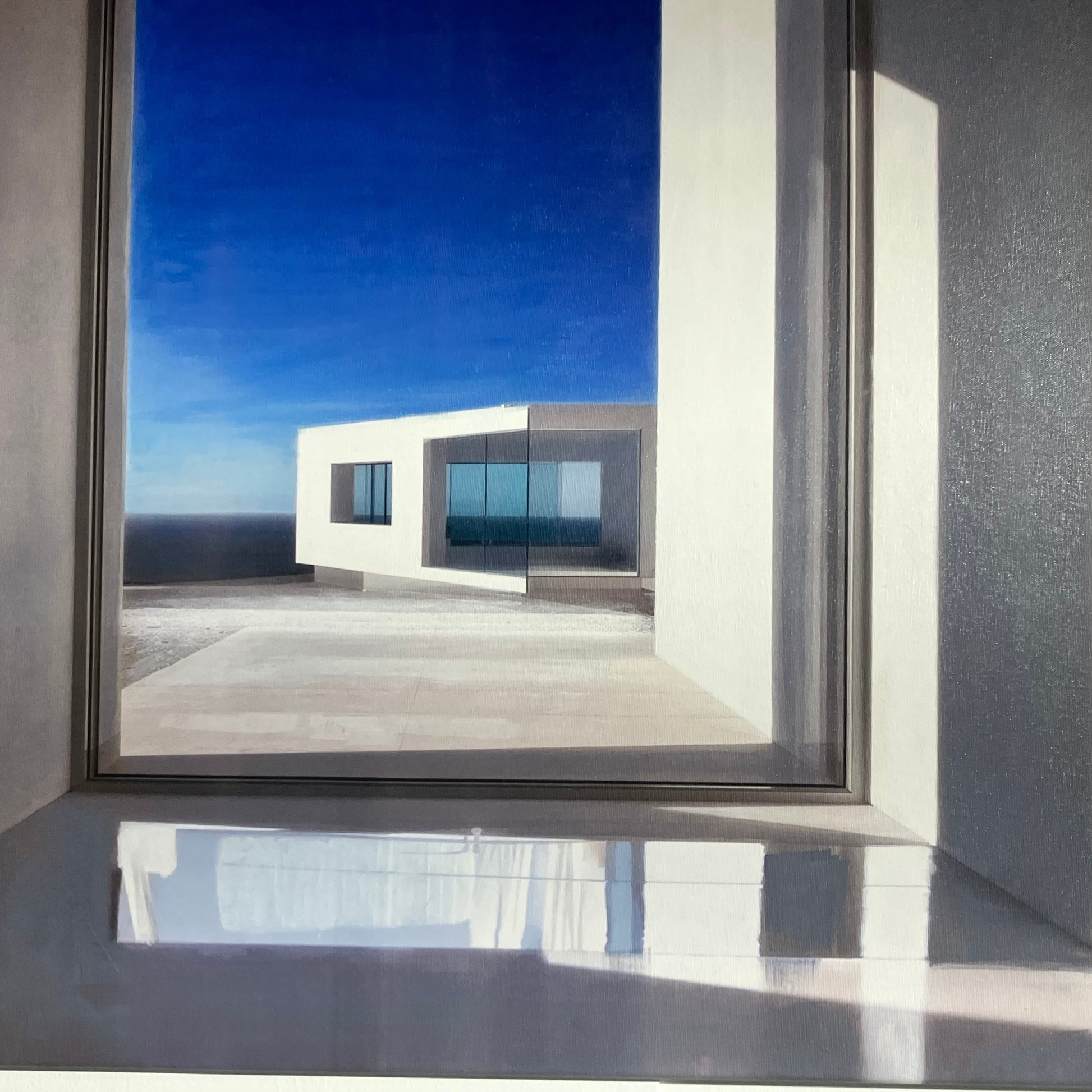 En ESSENTIA X la mirada se invierte. Por primera vez en la serie, observo la arquitectura desde un espacio interior: un marco dentro del cuadro que señala el límite entre lo ideal y lo real. La figura humana ha desaparecido, pero su presencia se adivina en los rastros —la luz, los reflejos, la ropa tendida que irrumpe en la pureza arquitectónica.