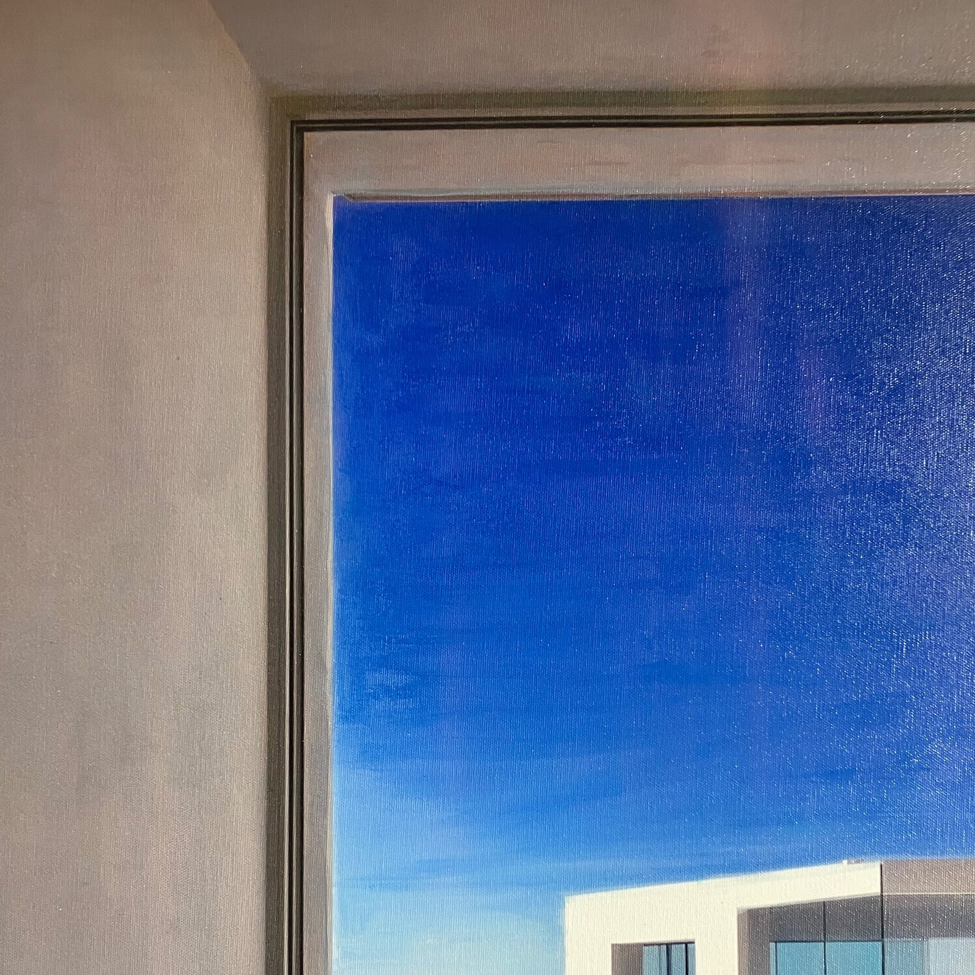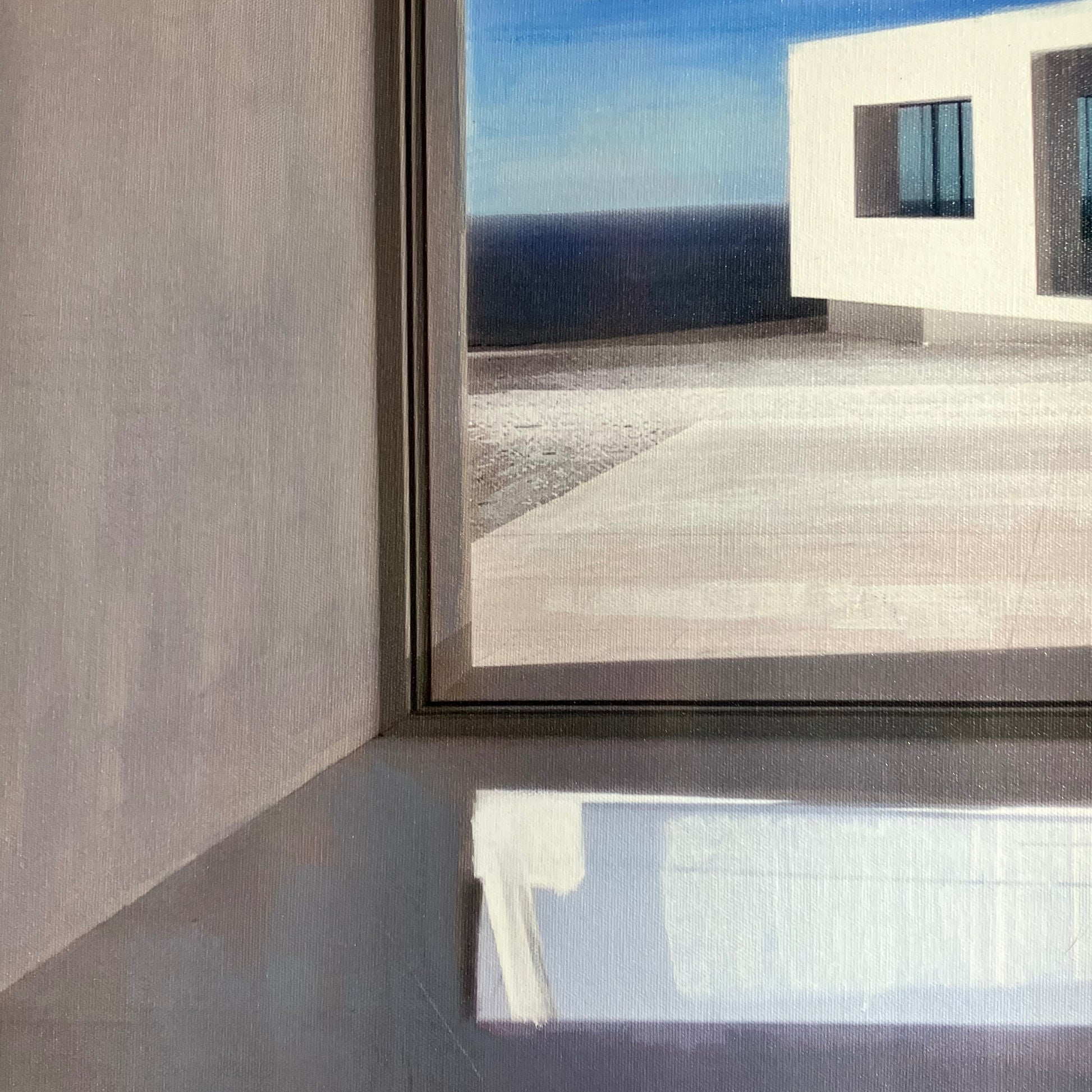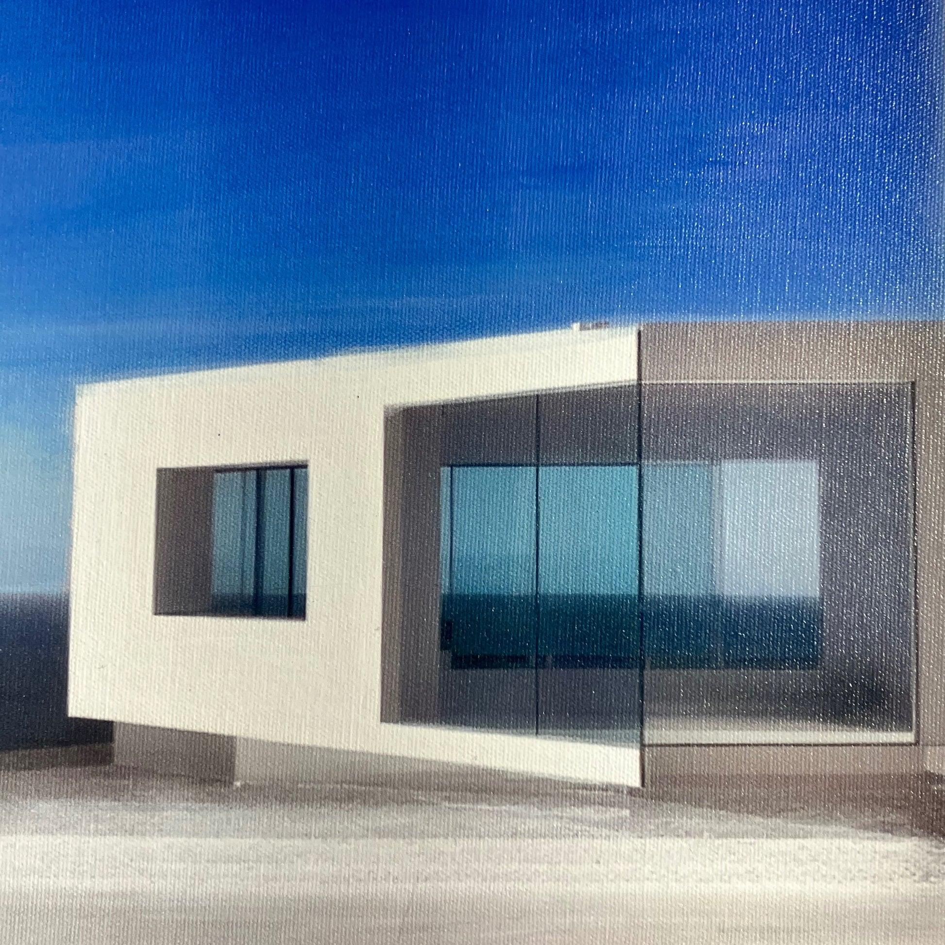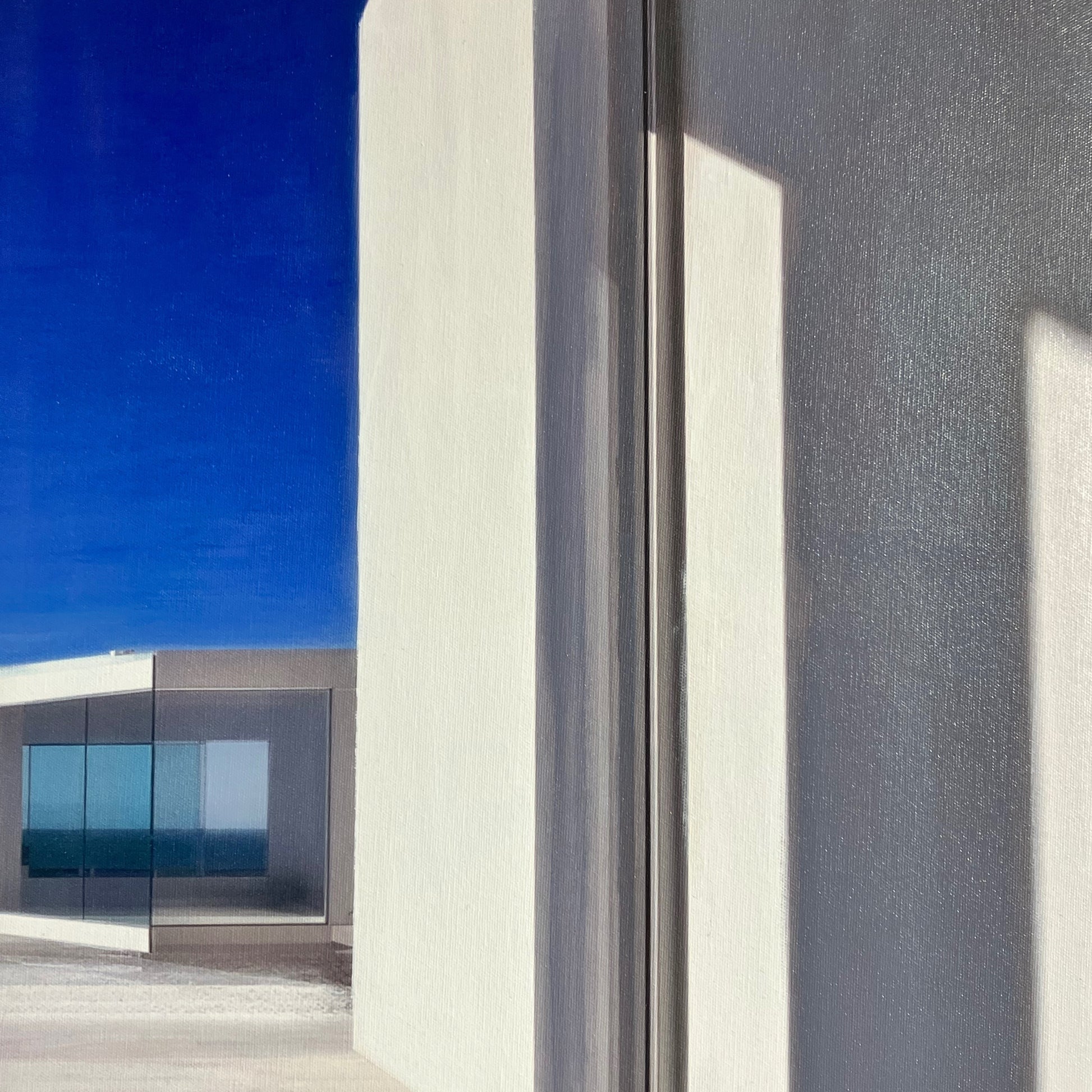 En ESSENTIA X la mirada se invierte. Por primera vez en la serie, observo la arquitectura desde un espacio interior: un marco dentro del cuadro que señala el límite entre lo ideal y lo real. La figura humana ha desaparecido, pero su presencia se adivina en los rastros —la luz, los reflejos, la ropa tendida que irrumpe en la pureza arquitectónica.