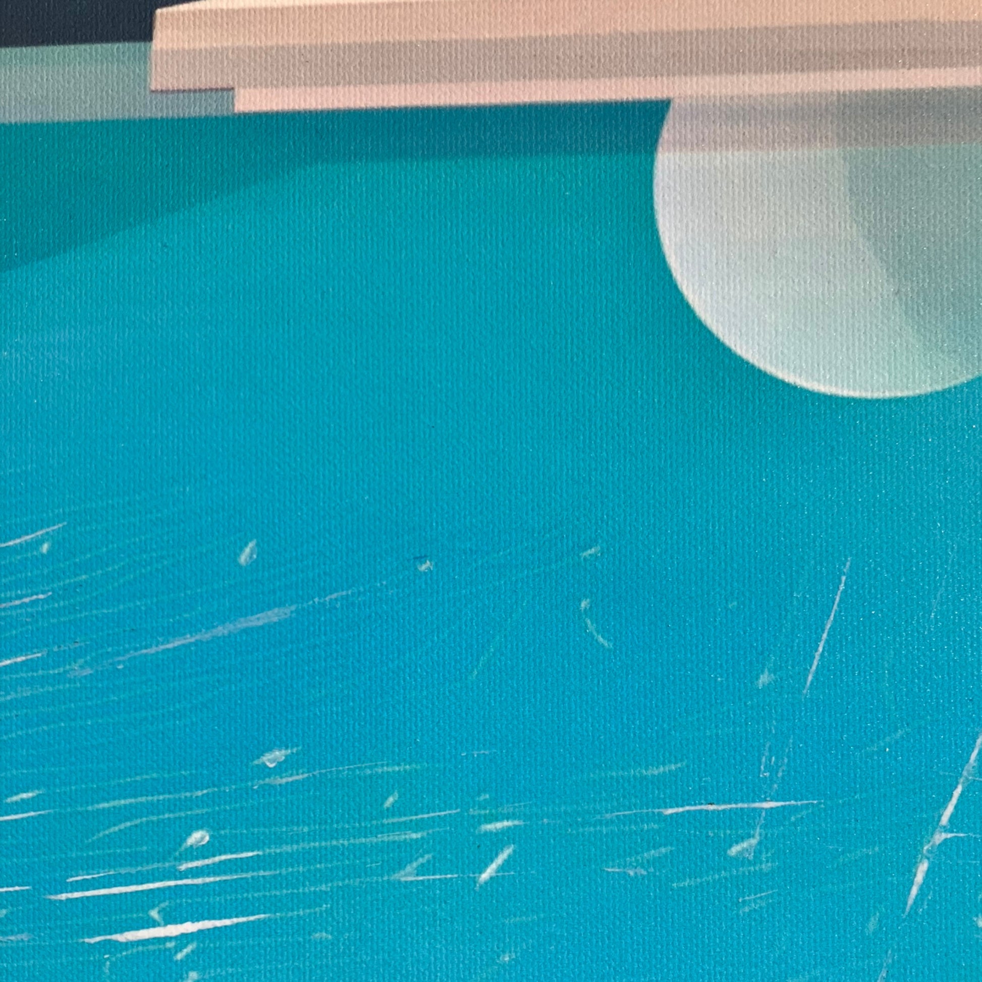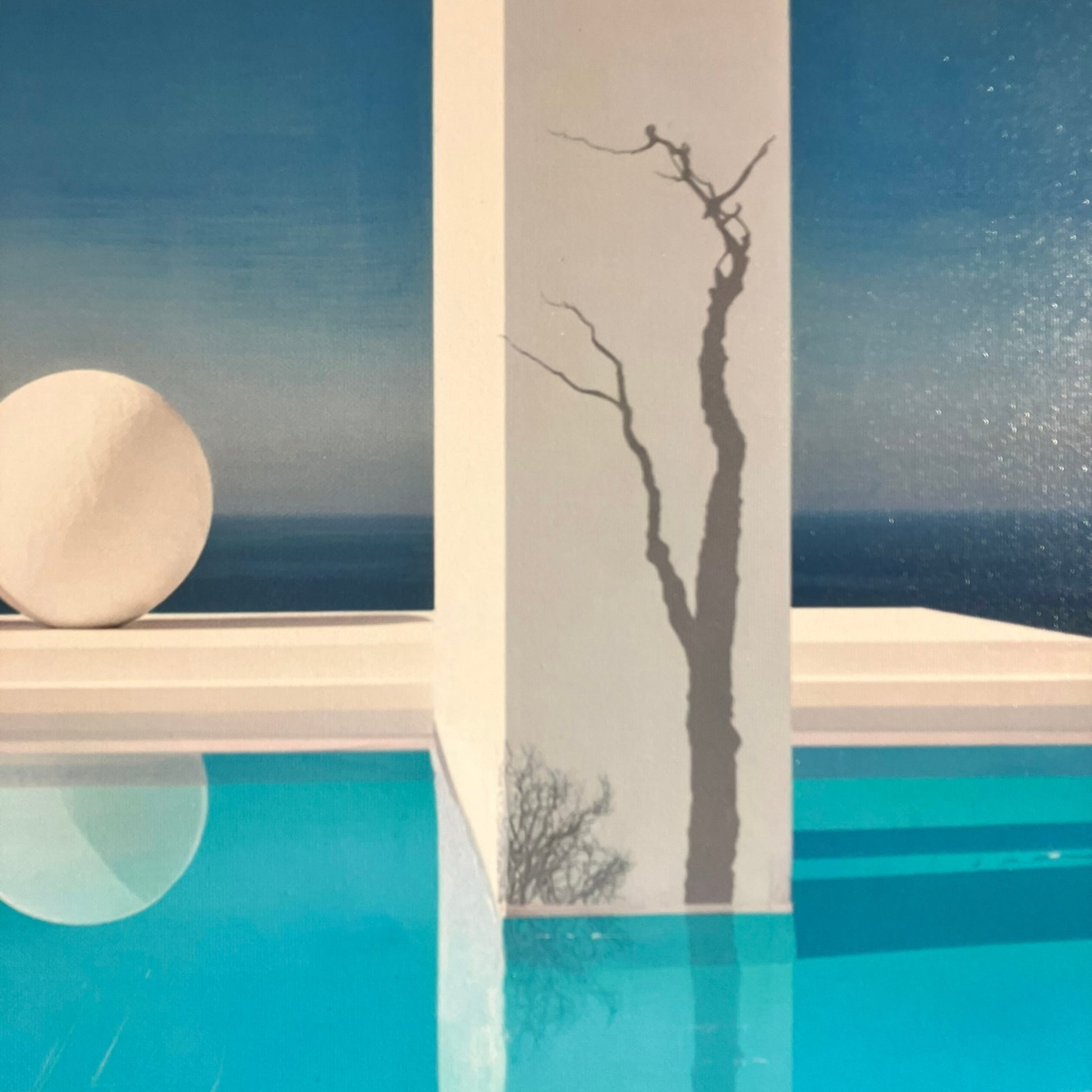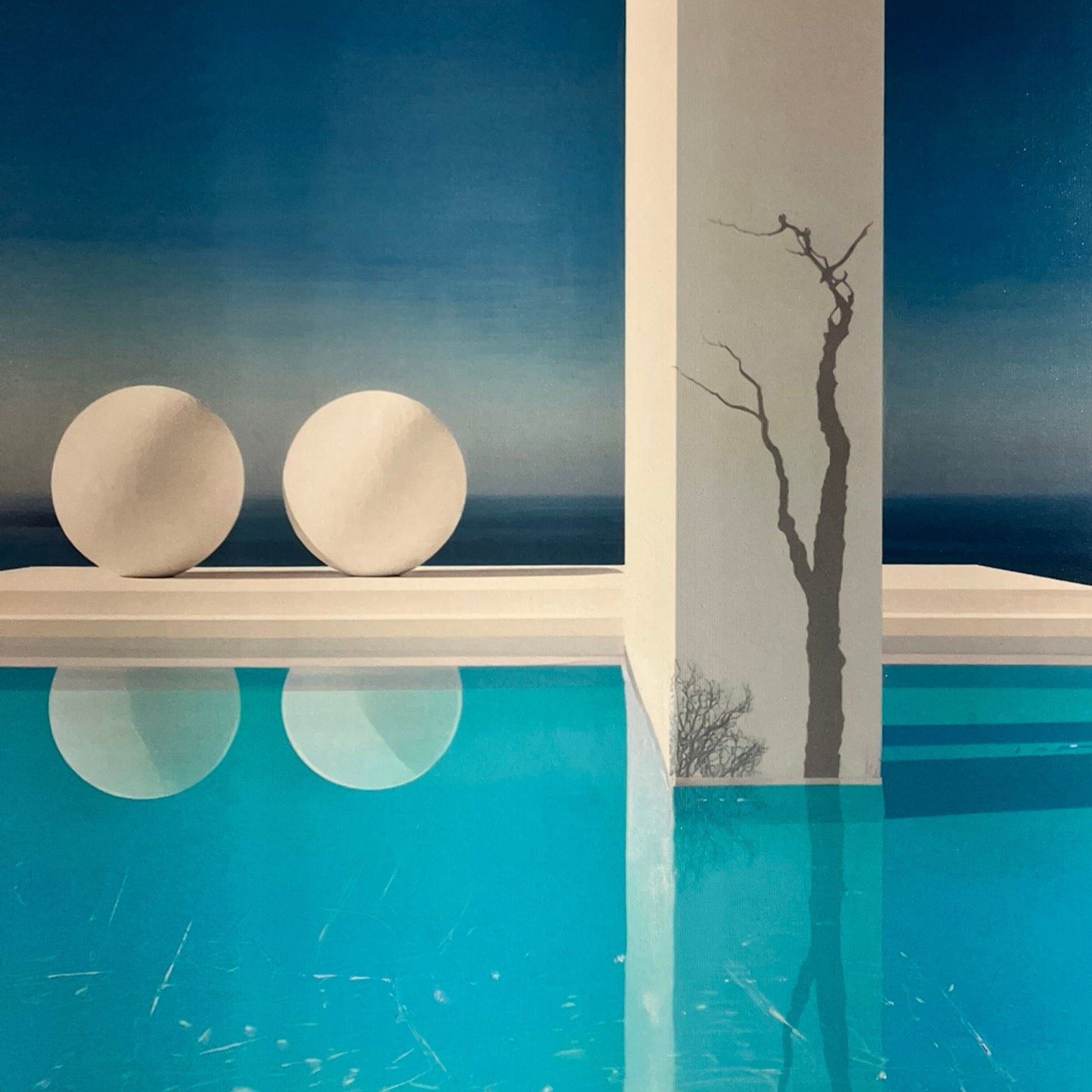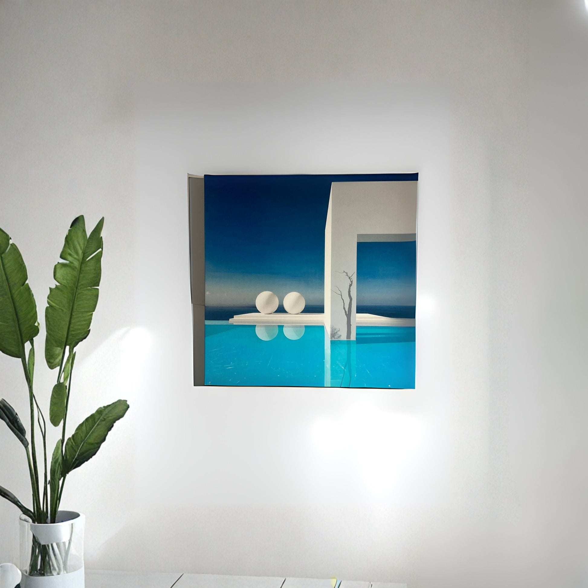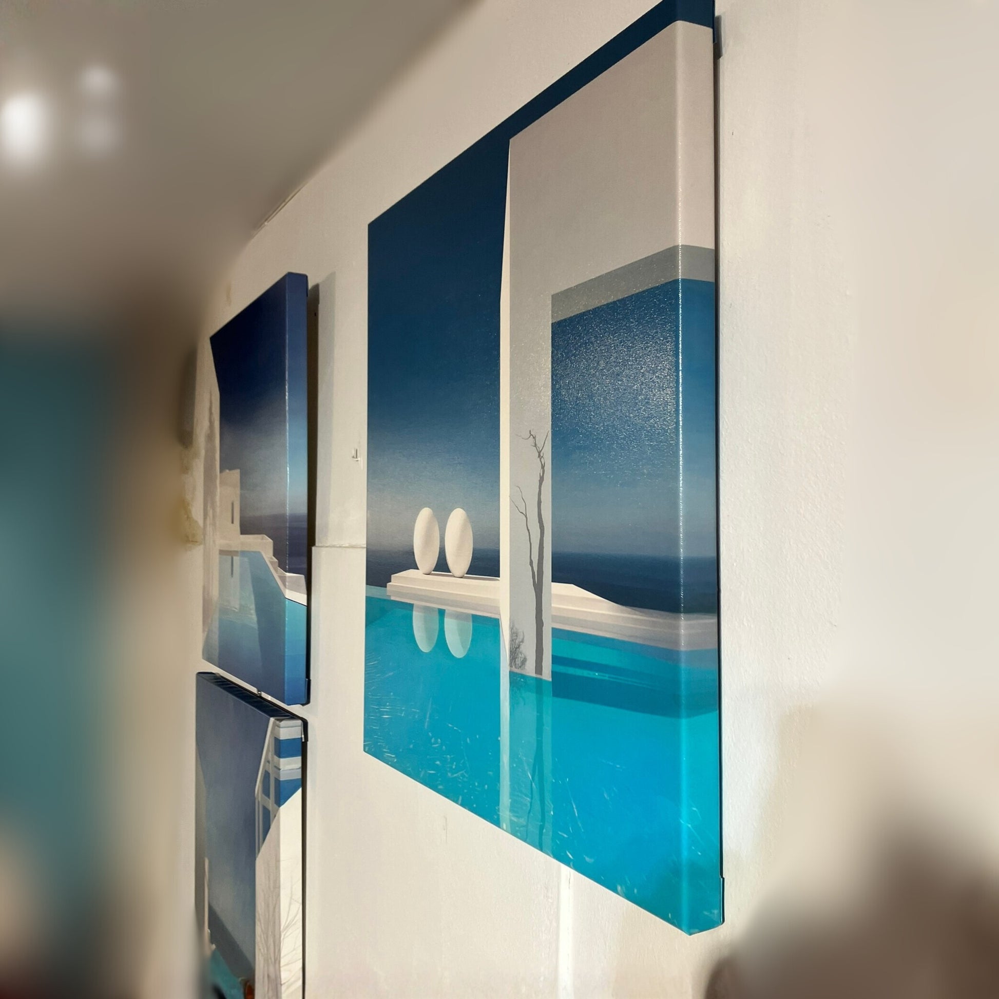 El procés combina intel·ligència artificial com a cocreadora, seguida d'una intervenció manual amb aerògraf i acrílic, generant un espai on la tecnologia i el gest humà dialoguen per revelar allò essencial: la quietud, la llum i la recerca d'equilibri entre allò natural i allò construït