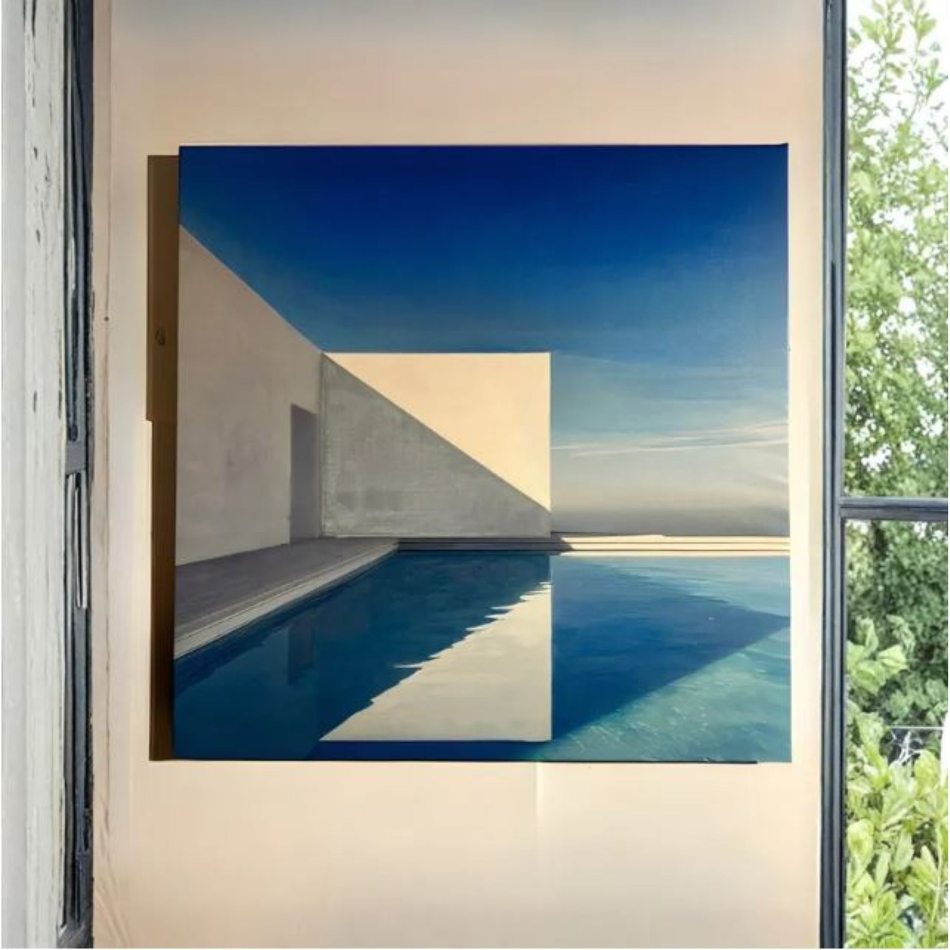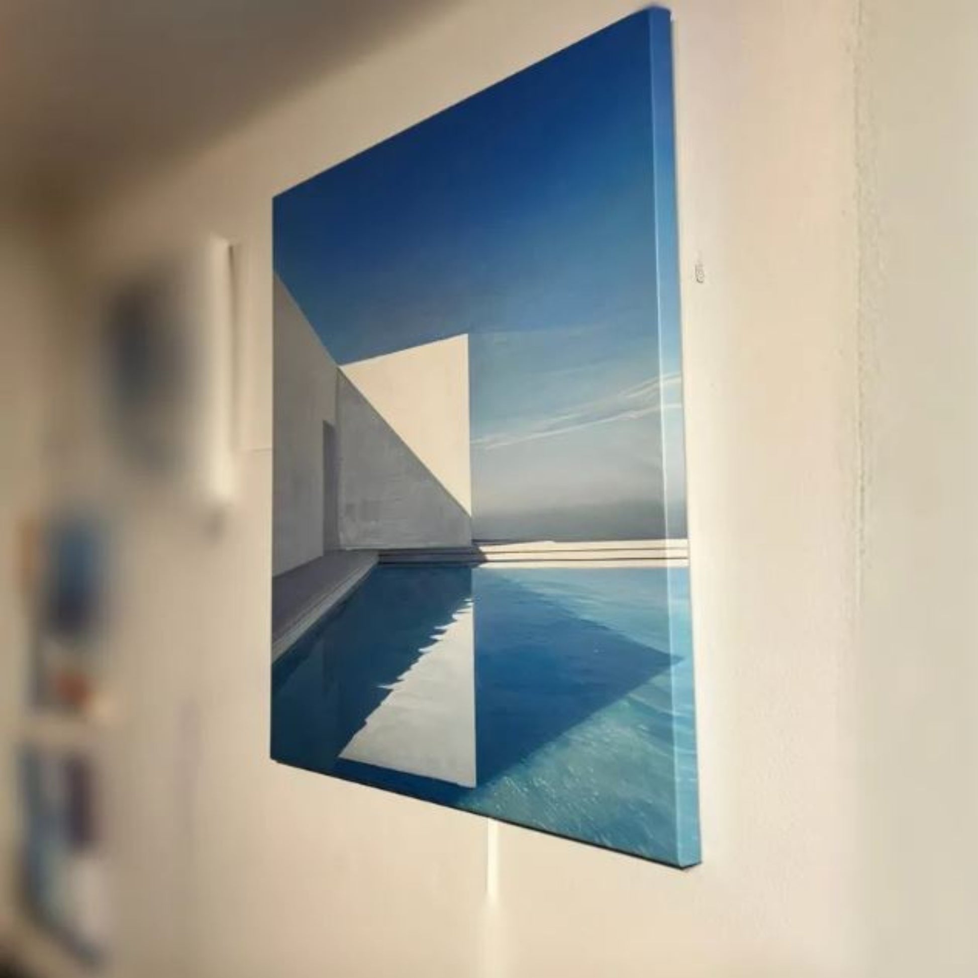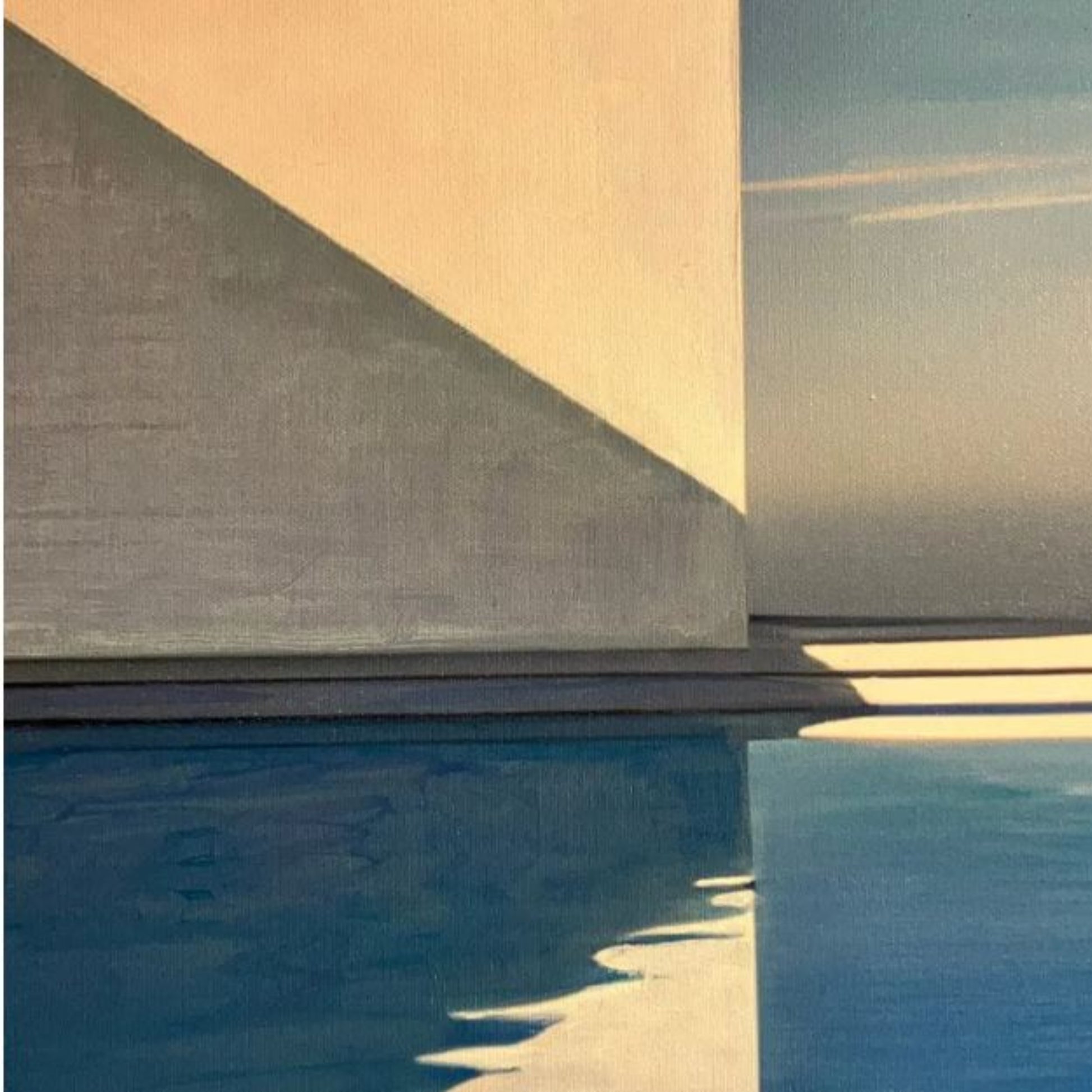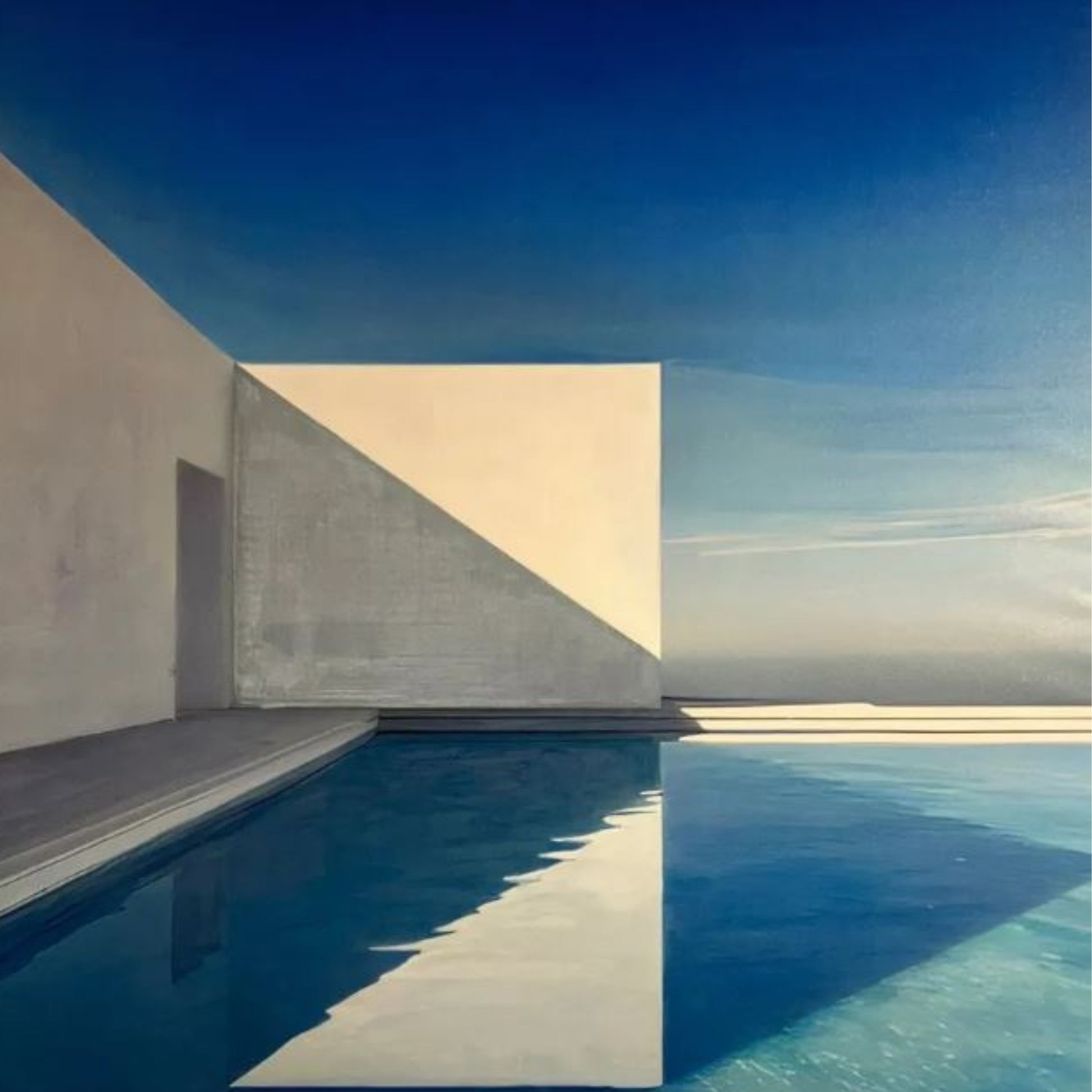 En esta obra, el paisaje construido se vuelve casi esencial: geometría pura, líneas limpias, agua y horizonte. No hay objetos, ni rastros directos de vida humana. Solo lo que queda cuando todo ruido desaparece.