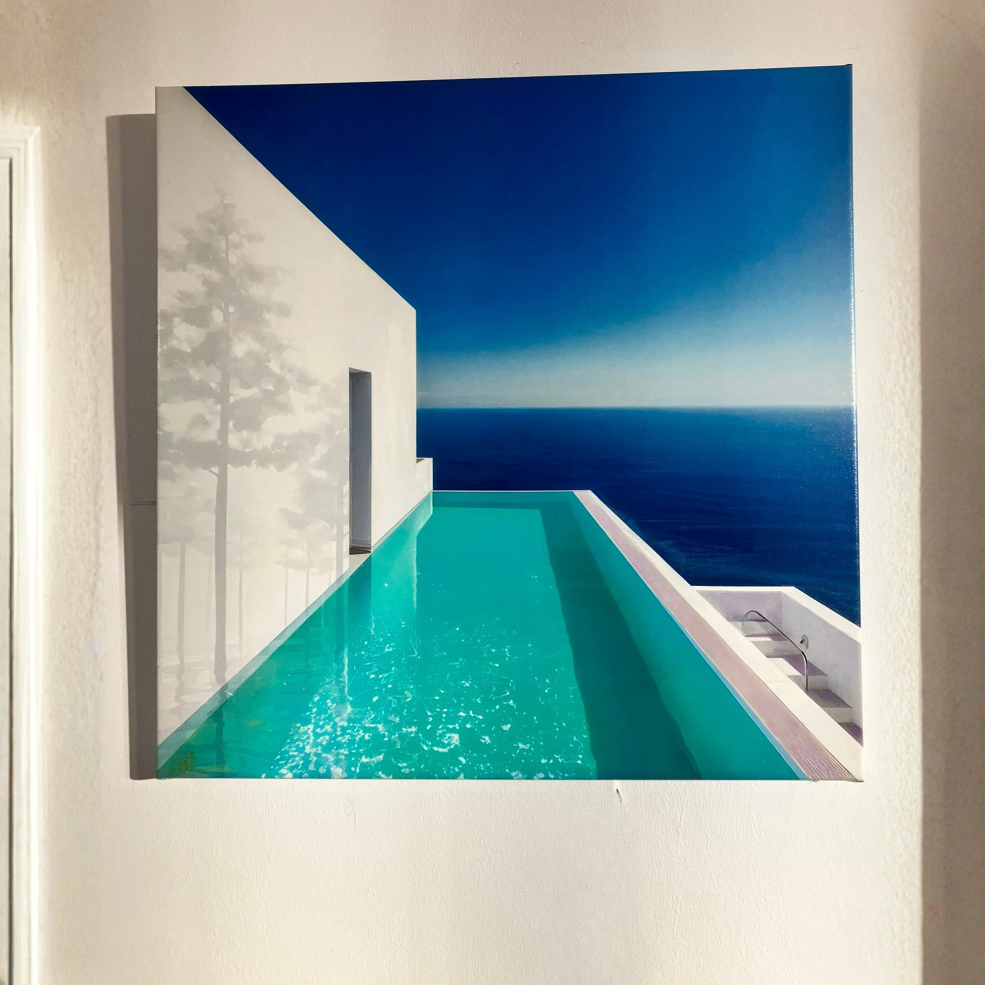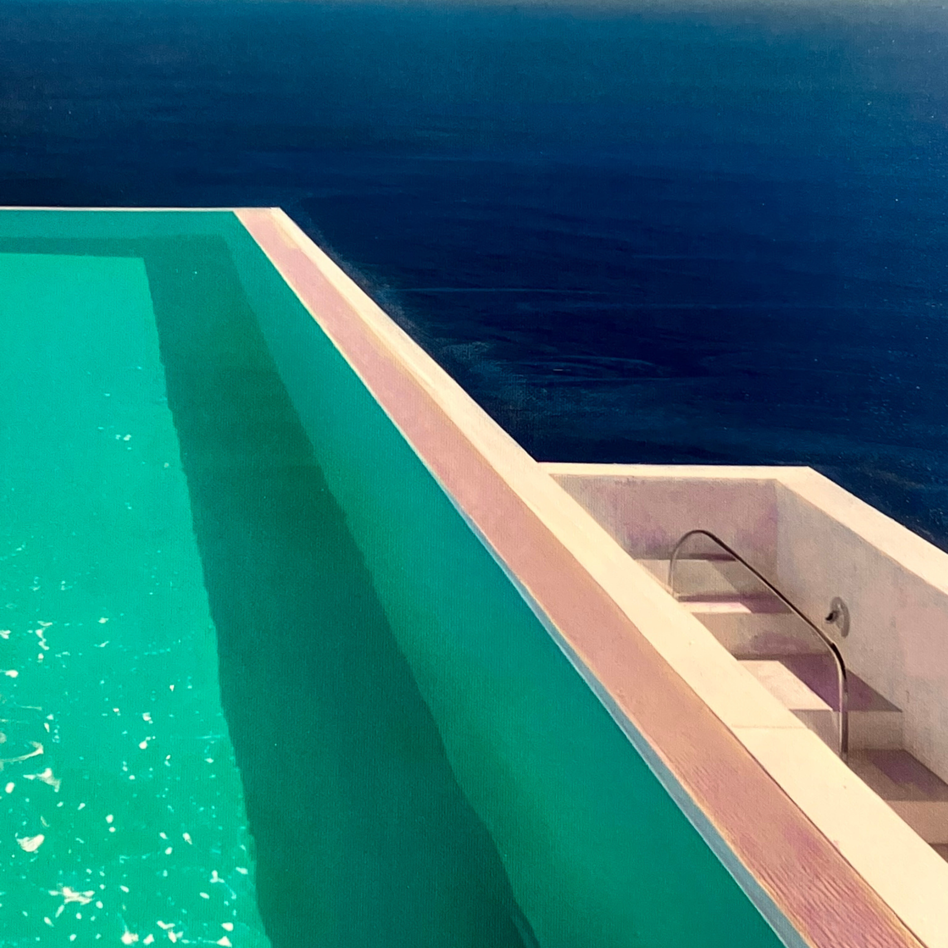 La escalera que desciende hacia el océano introduce la idea de tránsito. No invita a subir ni a habitar, sino a abandonar el espacio doméstico para fundirse con algo mayor, más vasto y menos controlable
