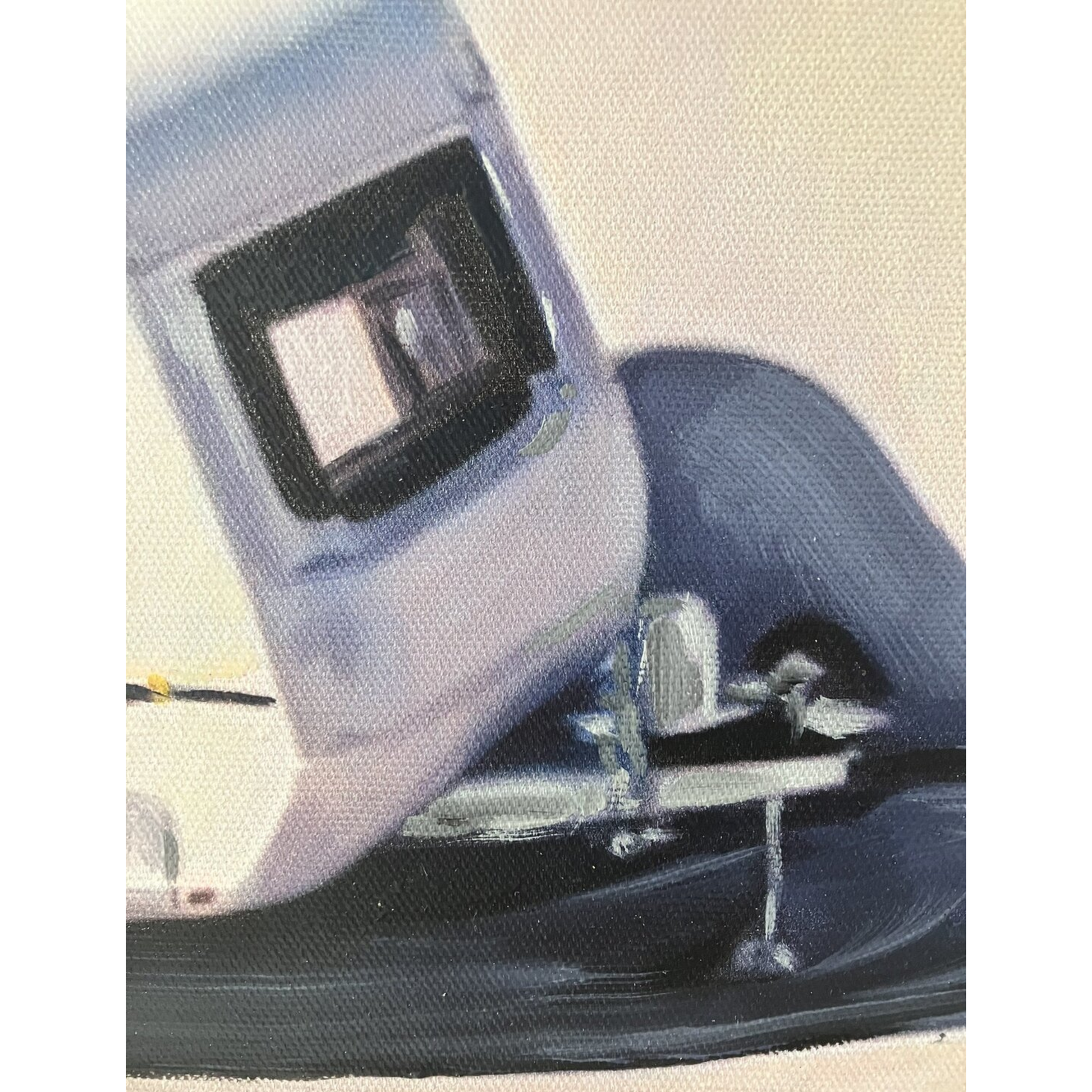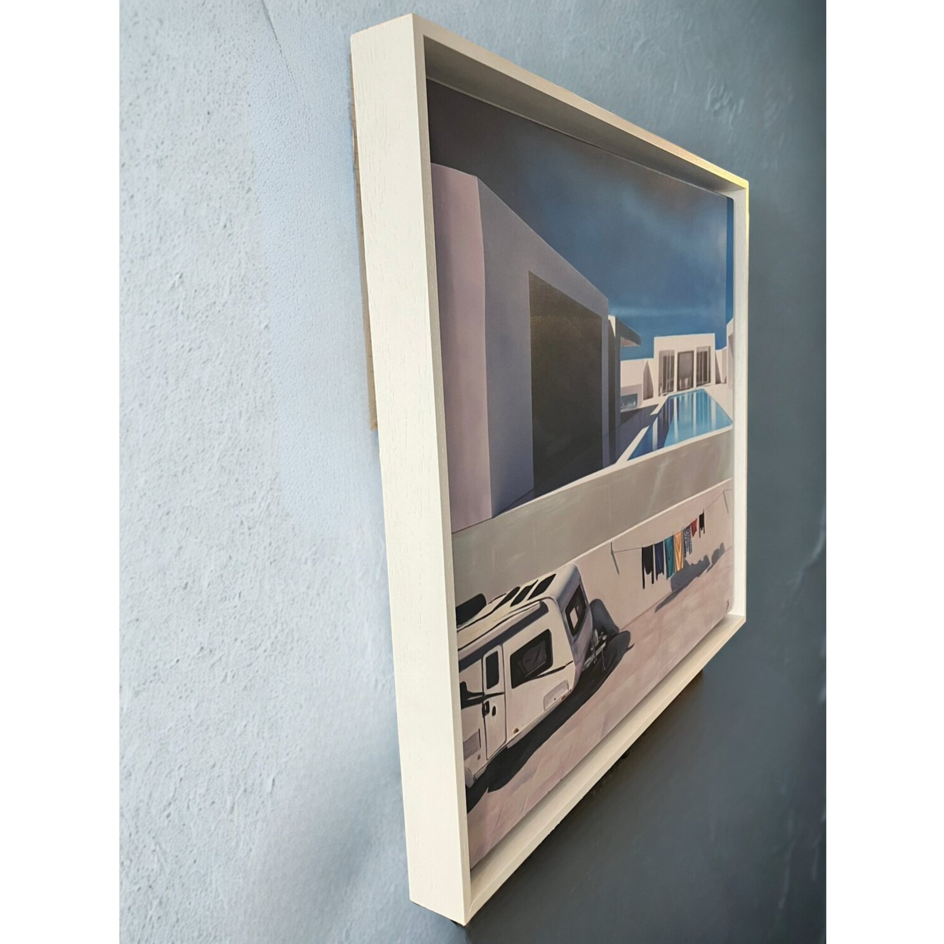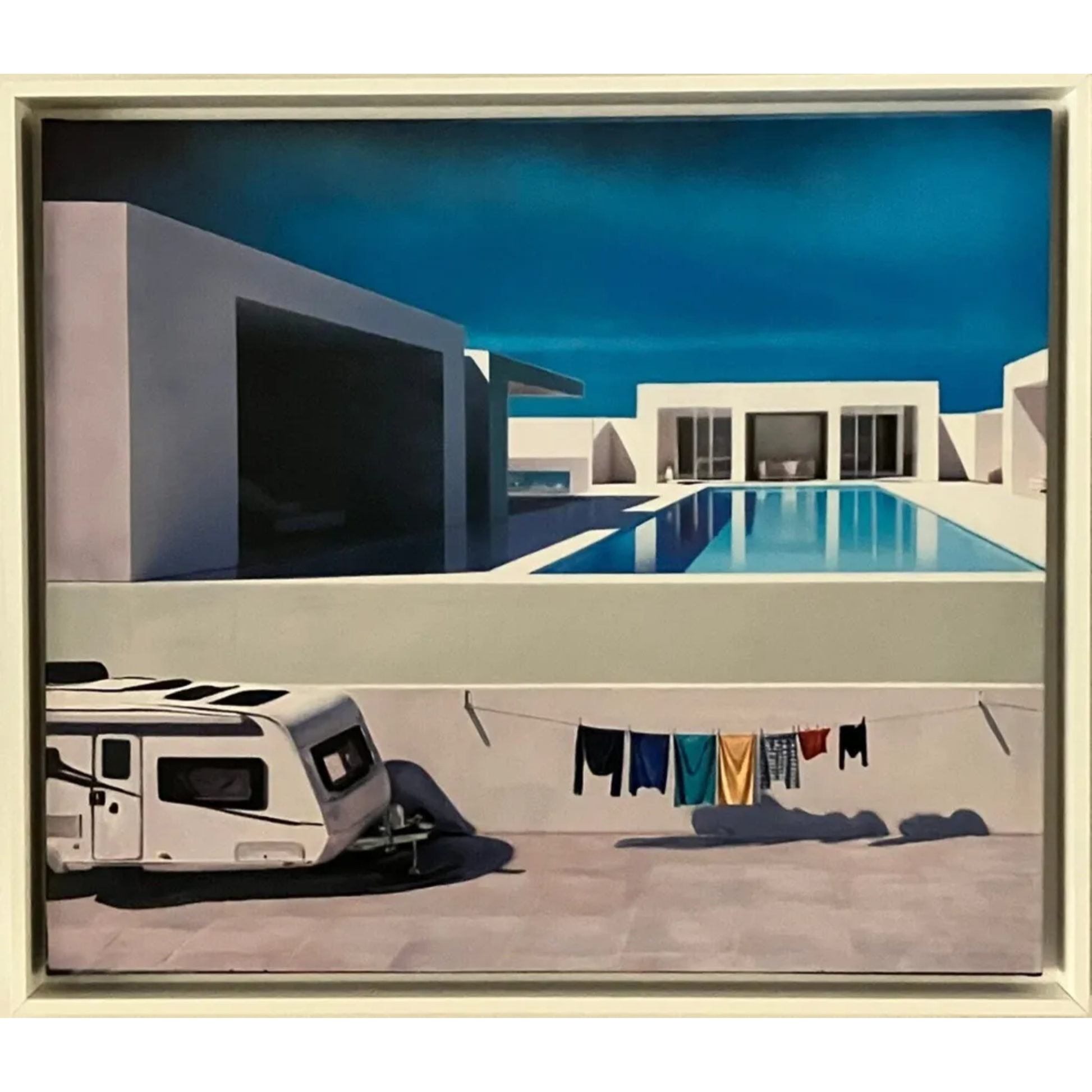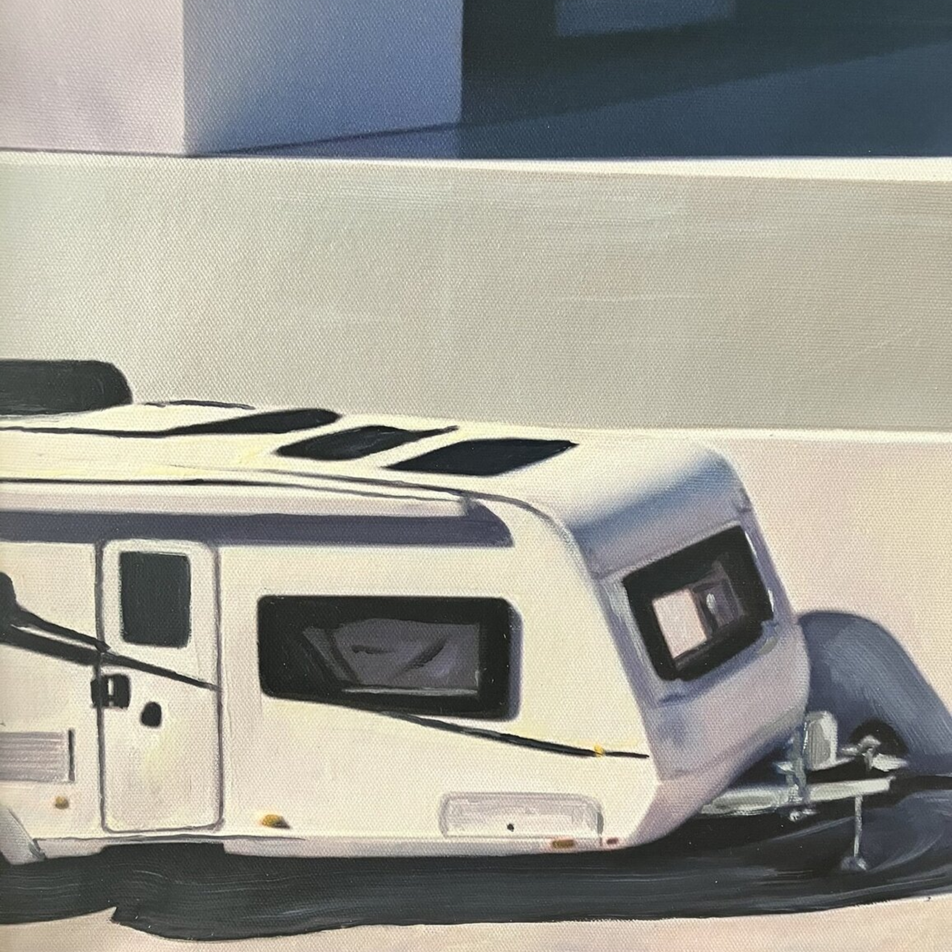 En esta pieza se enfrentan dos realidades: la pureza geométrica de una arquitectura blanca, ordenada y aspiracional, frente a los signos de lo frágil y lo humano —una caravana y una línea de ropa tendida.