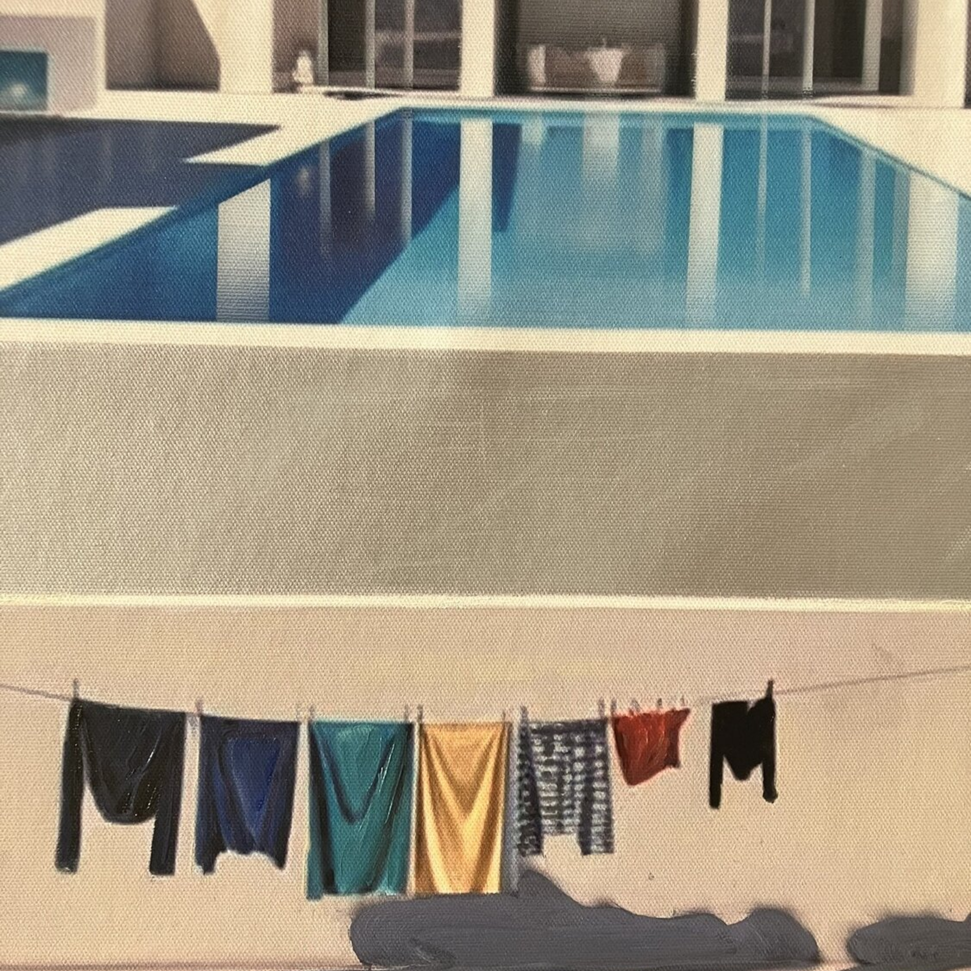 El agua, contenida y artificial, alude tanto al bienestar como a la apropiación de un bien esencial. La ausencia de figuras no implica vacío: es un espacio de proyección, donde el espectador habita simbólicamente la tensión entre lujo y precariedad.