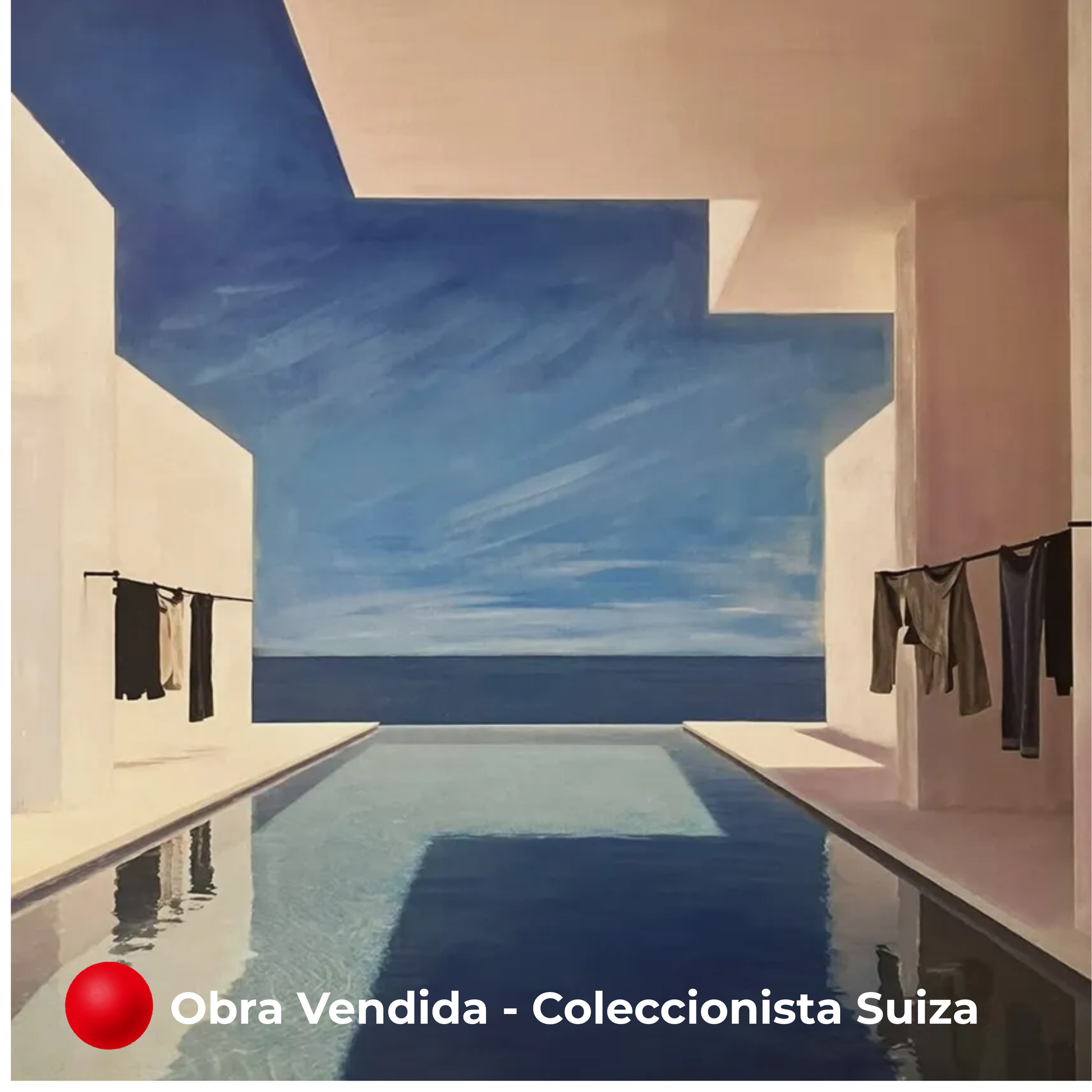 La inteligencia artificial genera un espacio arquitectónico idealizado que, posteriormente, intervengo manualmente con acrílico, aerógrafo y óleo. Este diálogo entre tecnología y gesto humano constituye la esencia de la serie: una búsqueda de equilibrio entre lo mecánico y lo sensible.