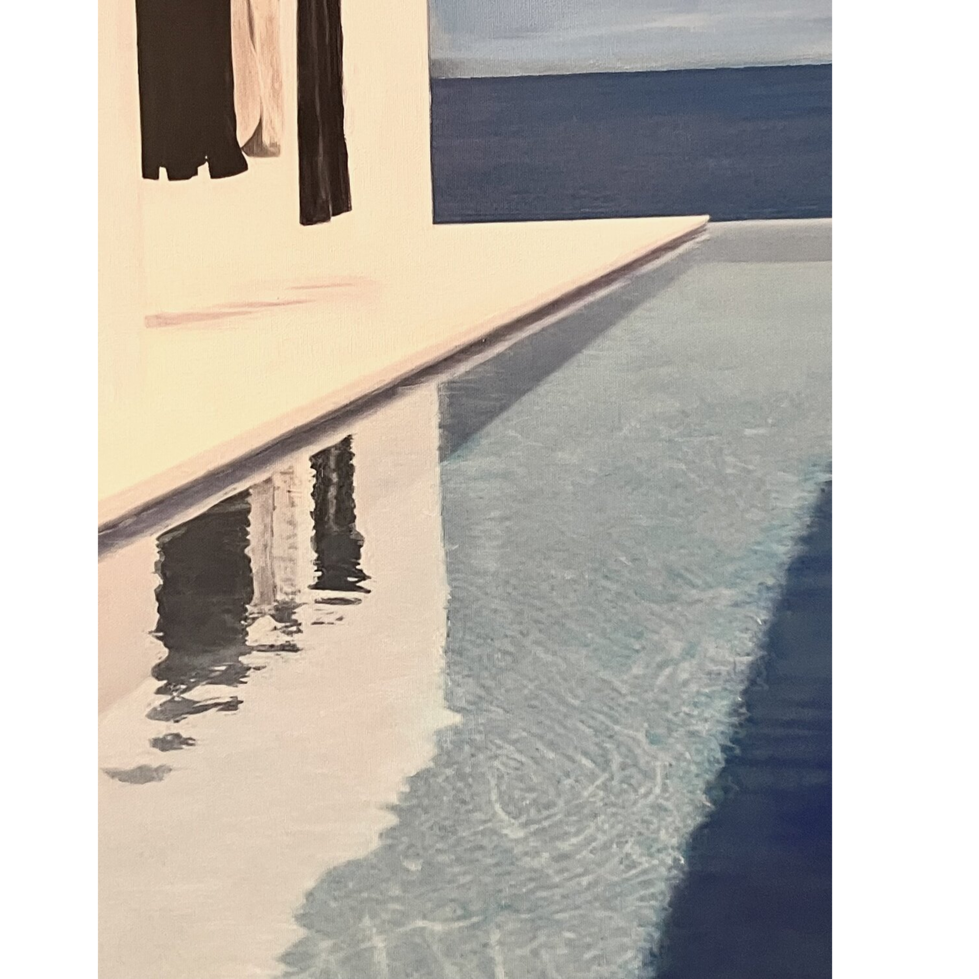 La escena muestra una arquitectura blanca y cerrada junto a una piscina, un entorno que aparenta serenidad y control absoluto. Sin embargo, la ausencia de figuras humanas y la tensión entre lo construido y el agua introducen una fisura en la perfección: lo esencial emerge precisamente en esa grieta donde el ideal se quiebra.