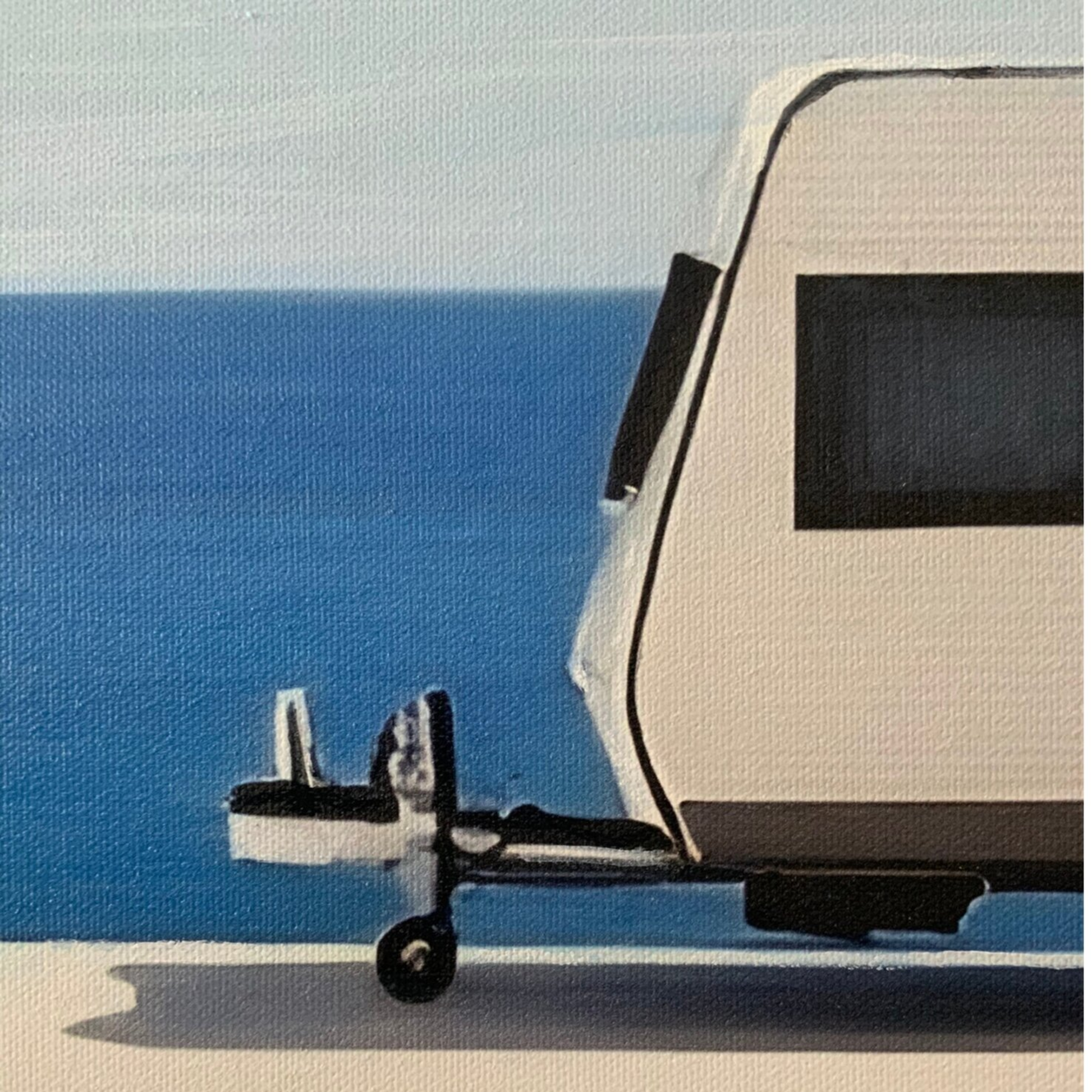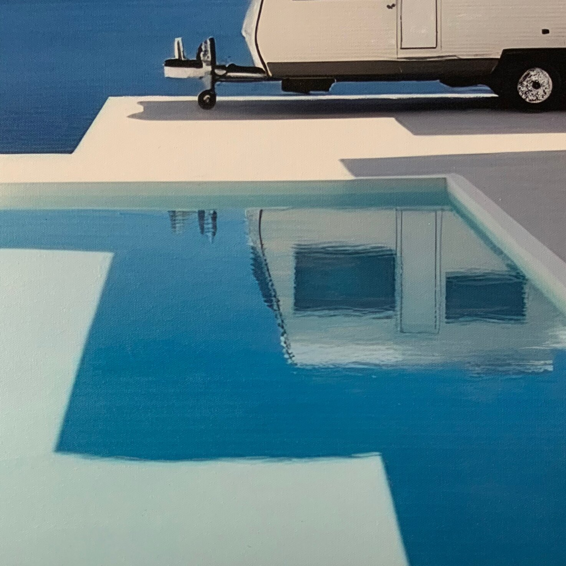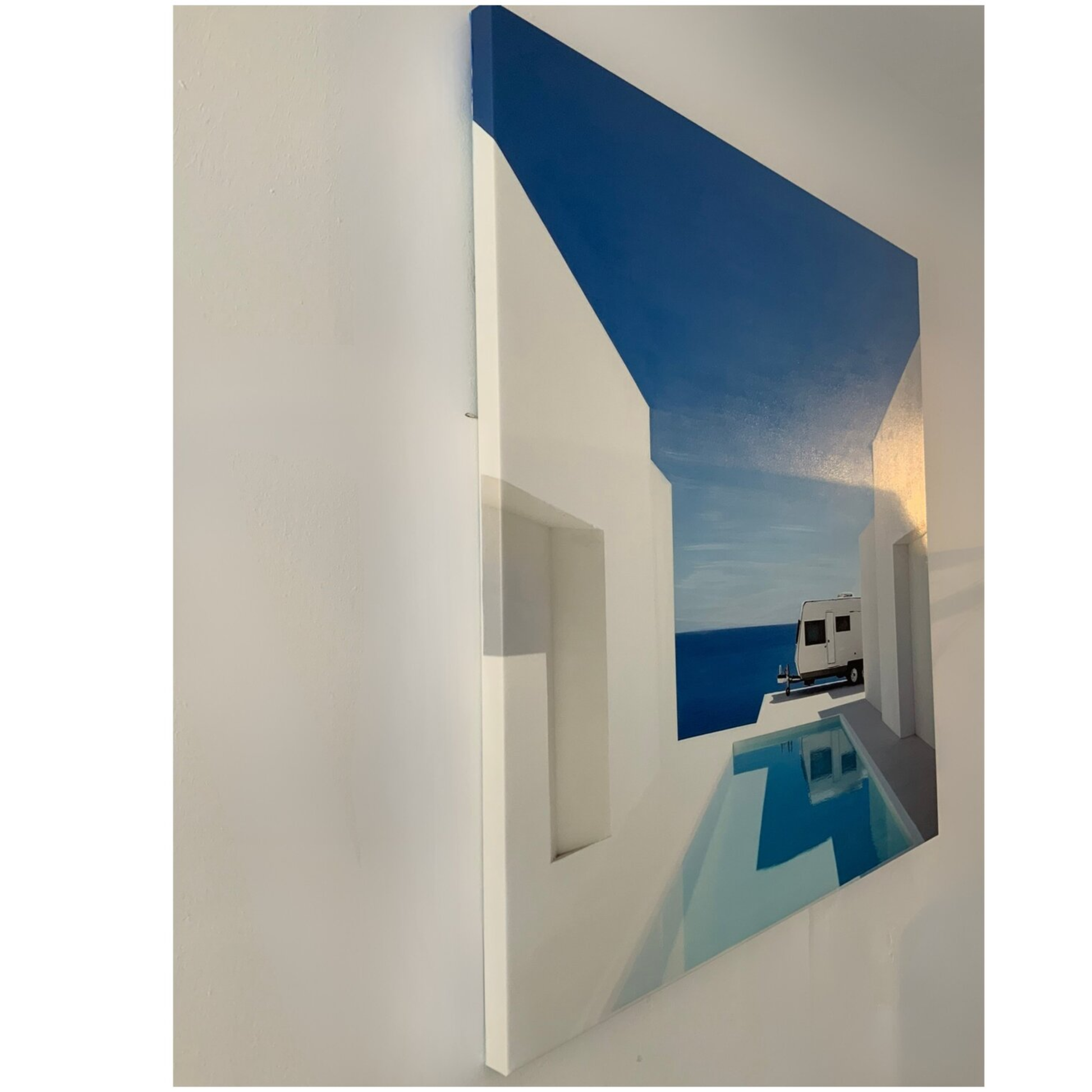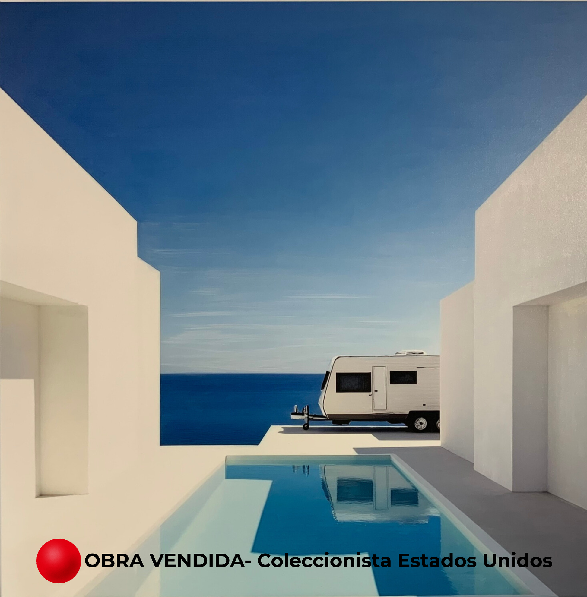 Trabajo desde la tensión entre lo perfecto y lo frágil. En ESSENTIA IV, la arquitectura blanca, la piscina y el cielo construyen una atmósfera de orden y calma visual. Sin embargo, esa armonía se quiebra con la presencia de una caravana: un cuerpo extraño que introduce desplazamiento, vida y una sutil incomodidad.
