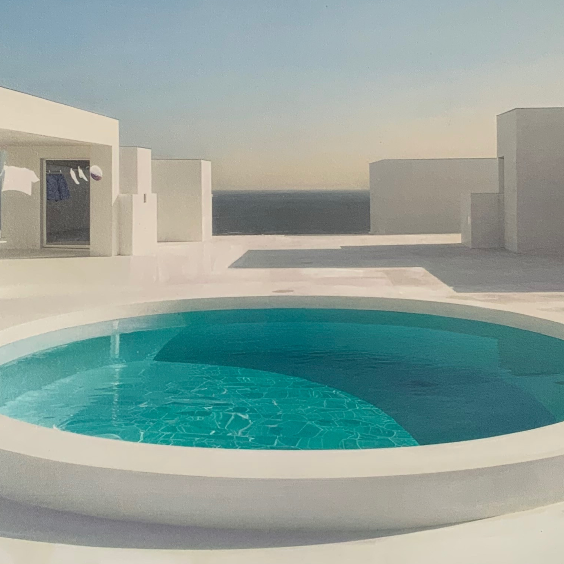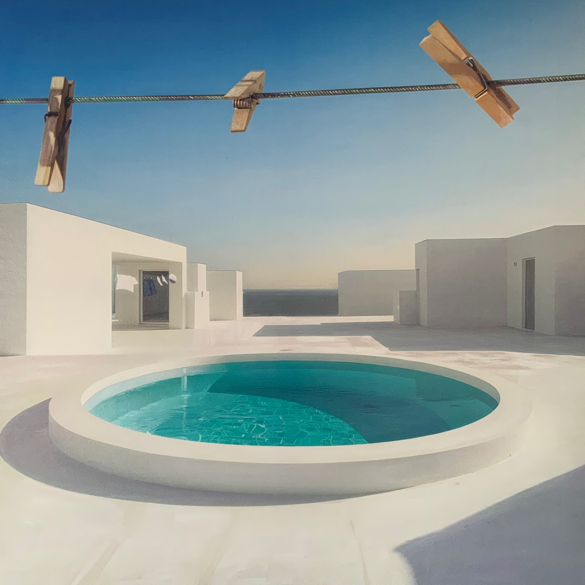 La obra presenta una arquitectura blanca, limpia y precisa, organizada alrededor de una piscina pensada para el confort y el control. El agua está contenida, en calma. Sin embargo, no hay personas. El espacio permanece activo, pero sin uso ni destinatario.