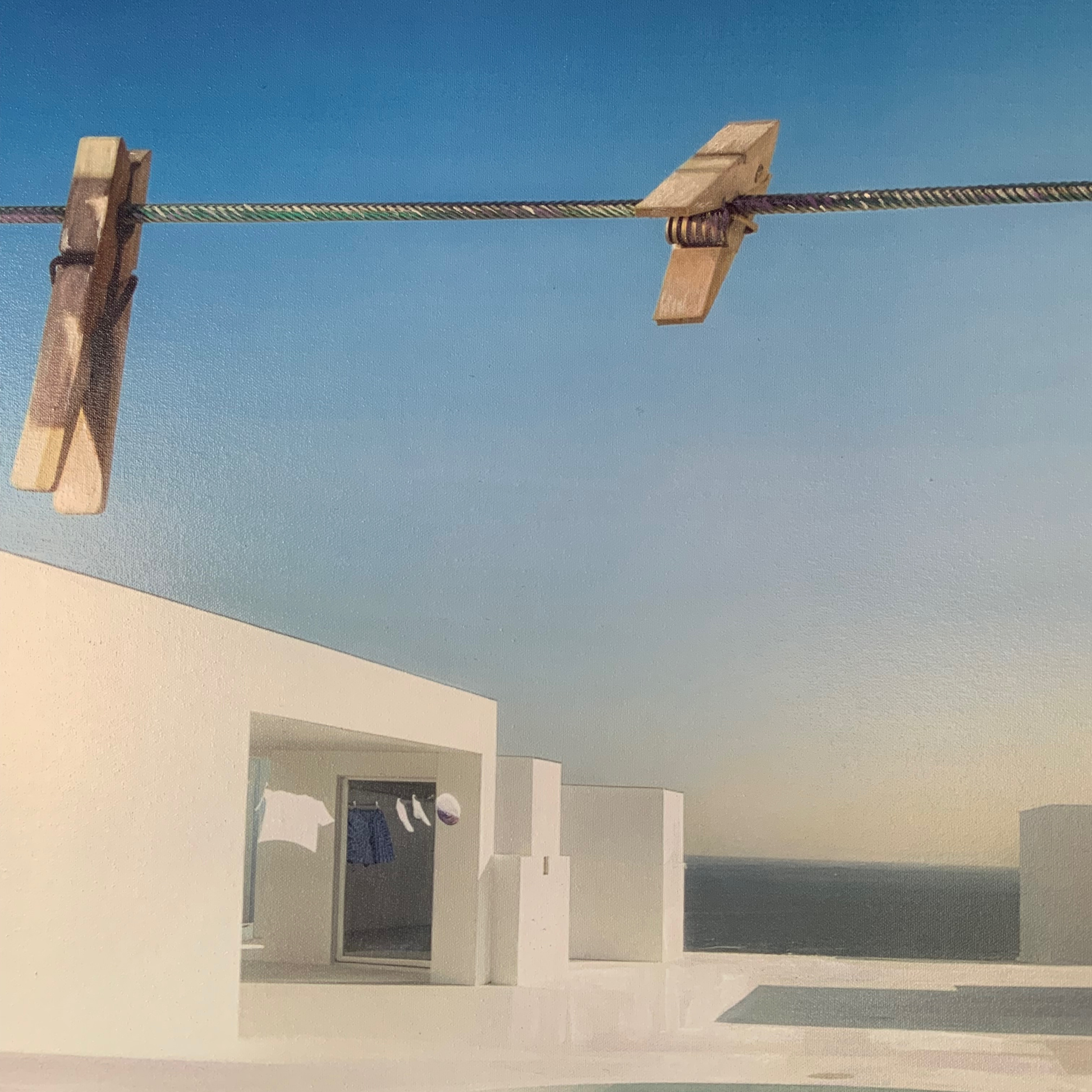 Un hilo con pinzas atraviesa la escena y rompe la perfección del conjunto. Este gesto doméstico mínimo introduce una tensión sutil en un entorno cuidadosamente ordenado, dejando un rastro cotidiano que no devuelve la presencia, pero sí cuestiona el equilibrio del espacio.