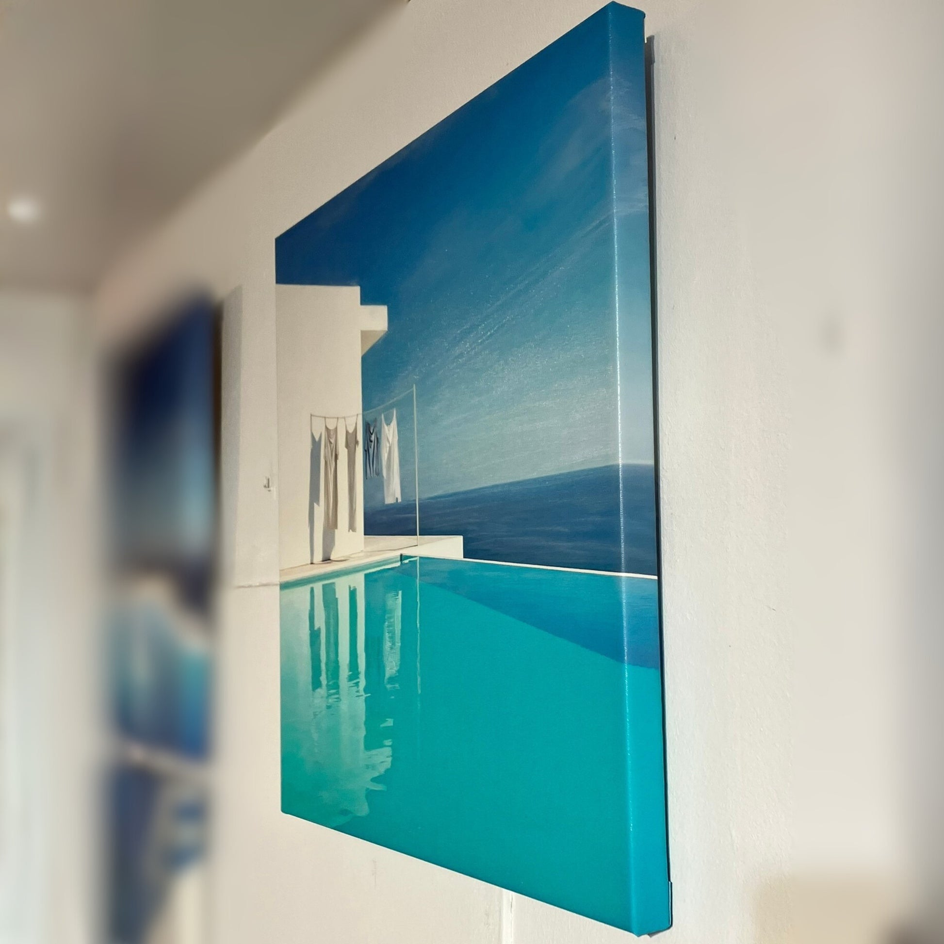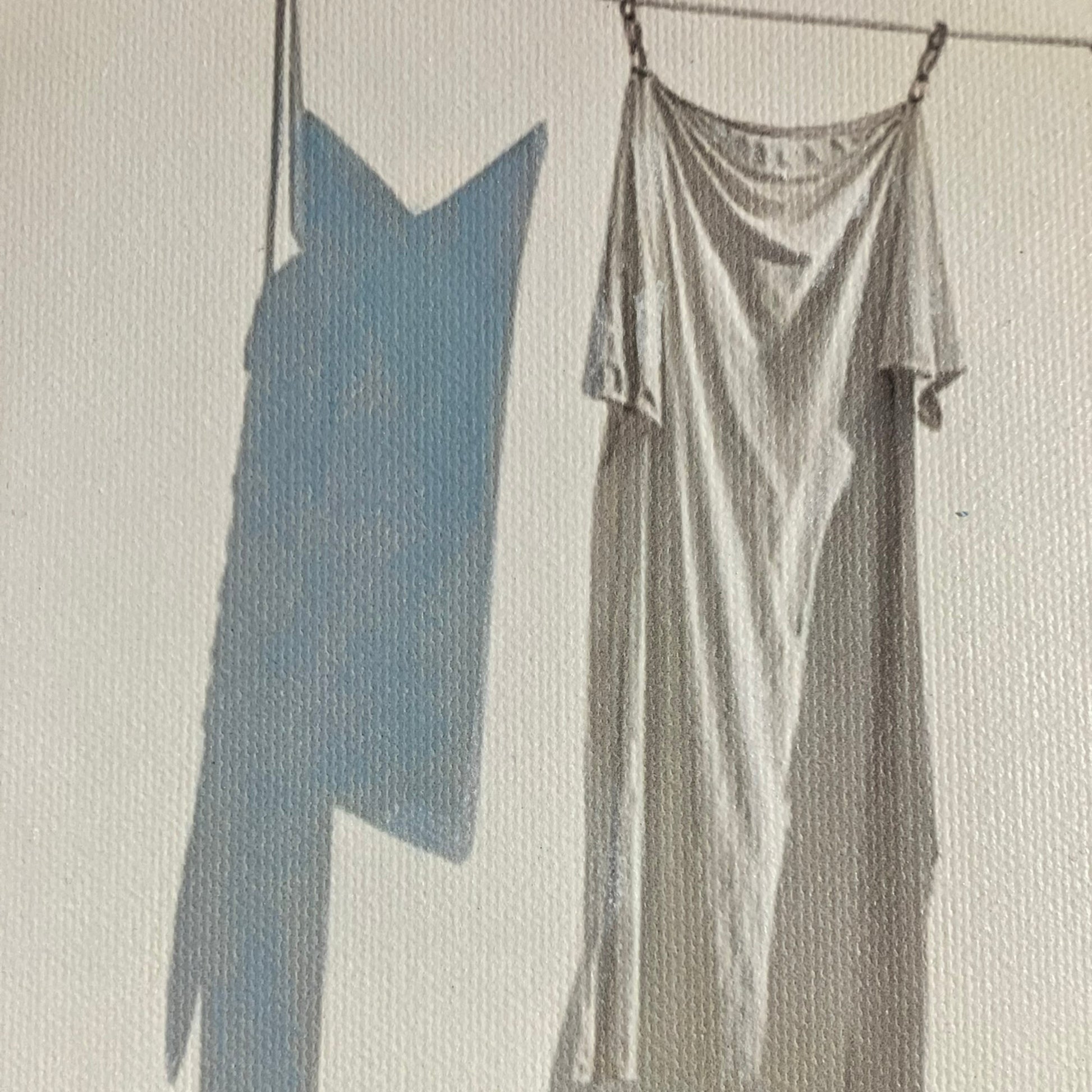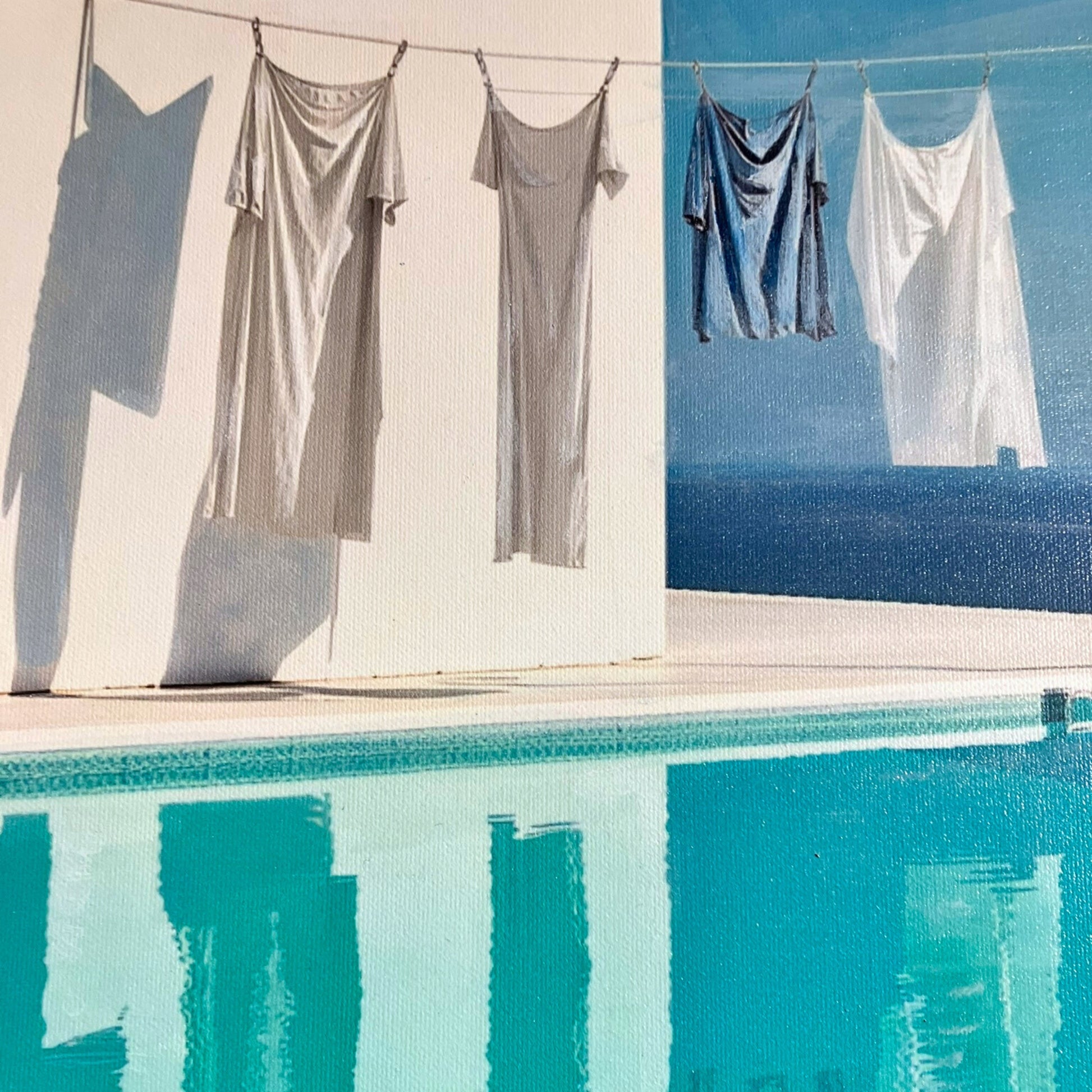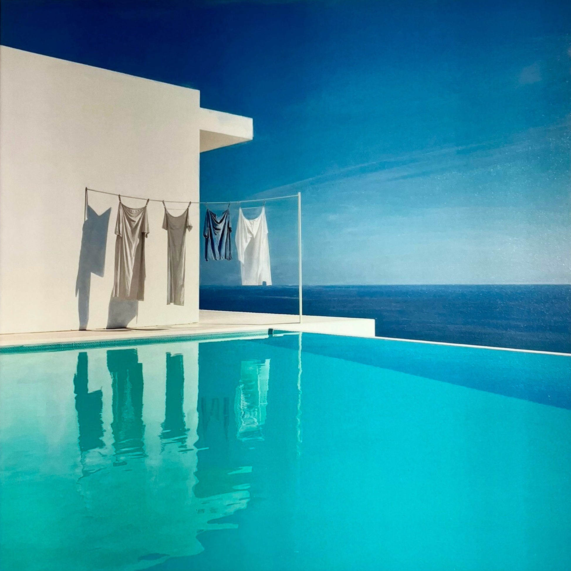 Esta obra continúa la investigación de la serie ESSENTIA, donde la arquitectura blanca, la luz y el horizonte se convierten en un espacio mental más que físico. Aquí, las prendas suspendidas —habitadas solo por su propia sombra— funcionan como huellas silenciosas de la presencia humana: un vestigio, una memoria que permanece incluso cuando el cuerpo ya no está.